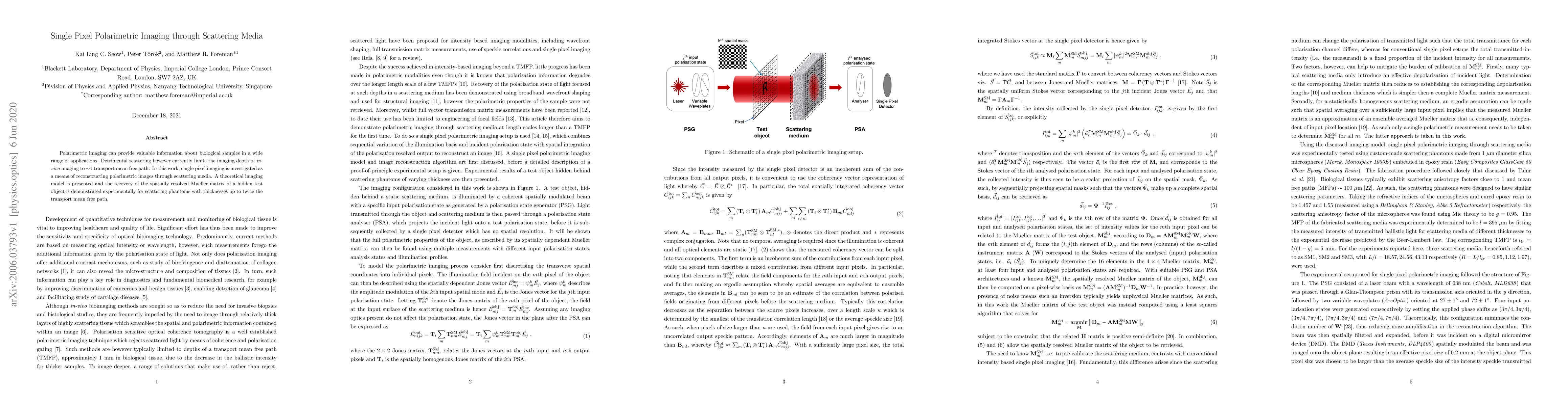 This paper investigates single pixel imaging to reconstruct polarimetric images through scattering media, presenting a theoretical model and demonstrating the recovery of the Mueller matrix for phantoms up to twice the transport mean free path, overcoming current limitations in in-vivo imaging.