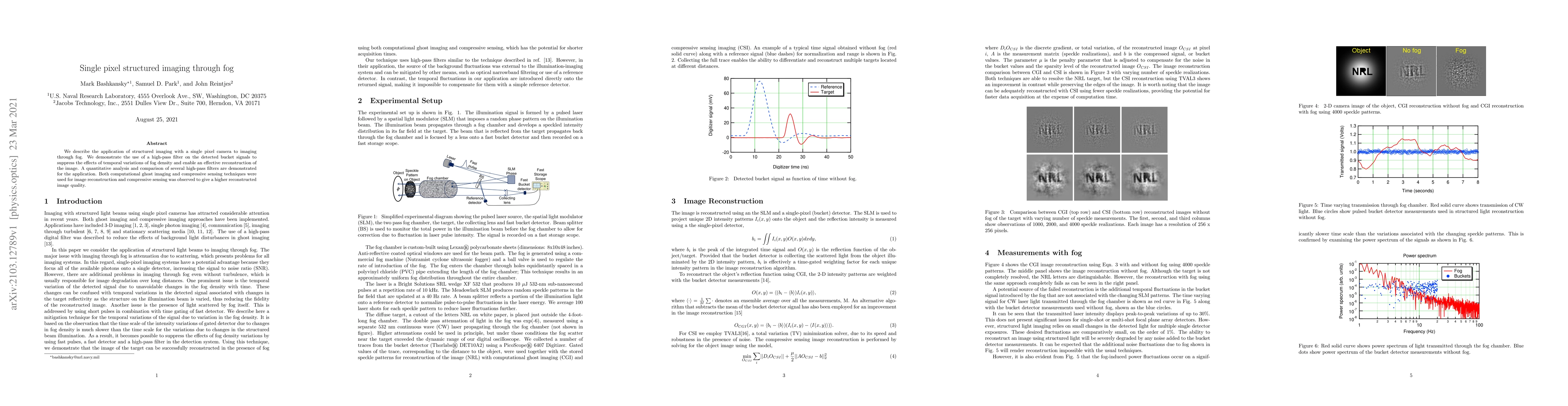 This paper explores the use of a single pixel camera for imaging through fog, employing high-pass filters to mitigate fog density variations. Compressive sensing techniques were found to yield higher image quality compared to computational ghost imaging.