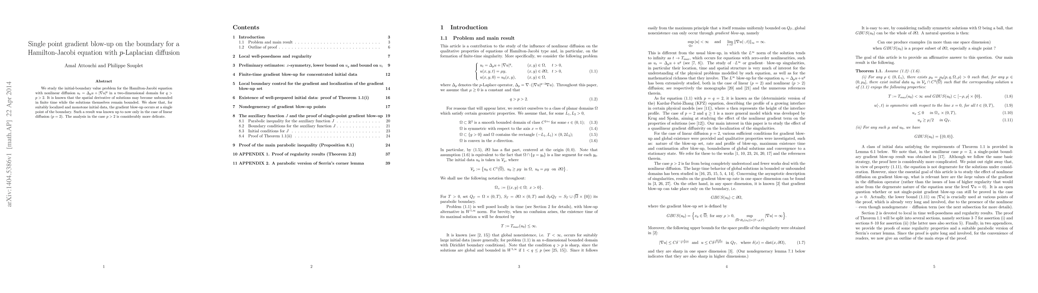 We study the initial-boundary value problem for the Hamilton-Jacobi equation with nonlinear diffusion $u_t=\Delta_p u+|\nabla u|^q$ in a two-dimensional domain for $q>p>2$. It is known that the spatial derivative of solutions may become unbounded in finite time while the solutions themselves remain bounded. We show that, for suitably localized and monotone initial data, the gradient blow-up occurs at a single point of the boundary. Such a result was known up to now only in the case of linear diffusion ($p=2$). The analysis in the case $p>2$ is considerably more delicate.