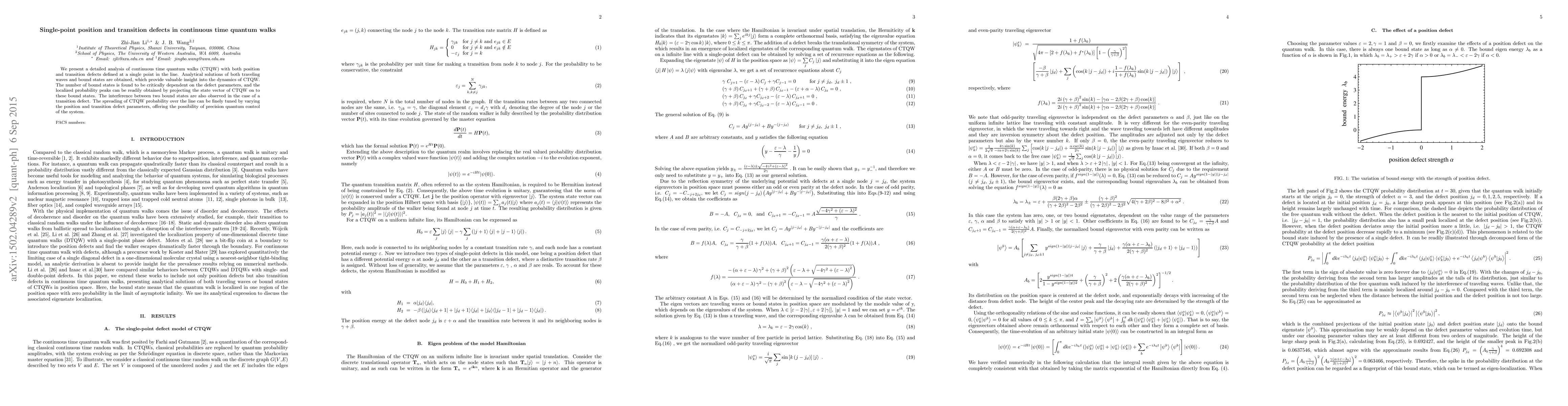 We present a detailed analysis of continuous time quantum walks (CTQW) with both position and transition defects defined at a single point in the line. Analytical solutions of both traveling waves or bound states are obtained, which provide valuable insight into the dynamics of CTQW. The number of bound states is found to be critically dependent on the defect parameters, and the localized probability peaks can be readily obtained by projecting the CTQW wavefunction on to these bound states. The interference between two bound states are also observed in the case of a transition defect. The spreading of CTQW probability over the line can be finely tuned by varying the position and transition defect parameters, offering the possibility of precision quantum control of the system.