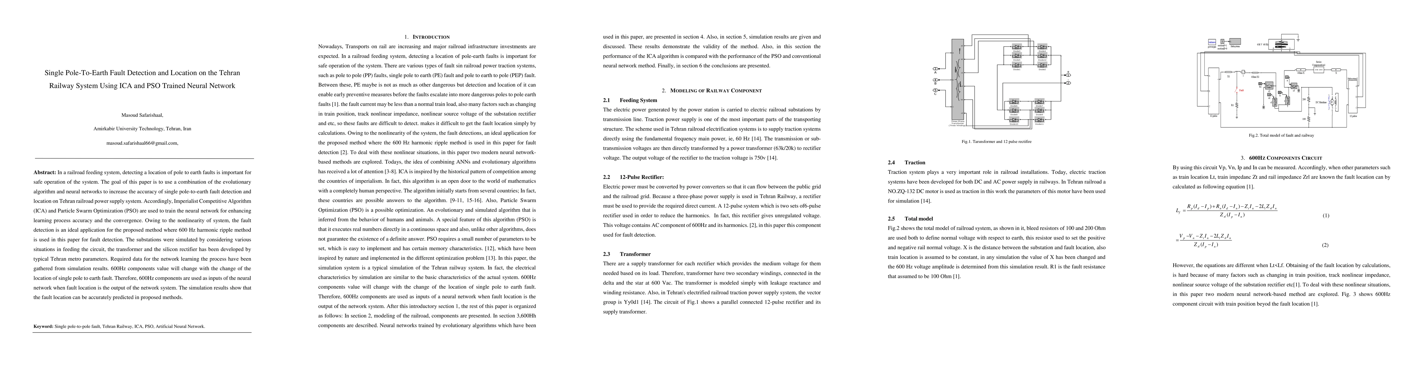 This paper proposes a method combining Imperialist Competitive Algorithm (ICA) and Particle Swarm Optimization (PSO) to train a neural network for detecting and locating single pole-to-earth faults on the Tehran railway system. The method uses 600 Hz harmonic ripple for fault detection and shows accurate fault location prediction through simulation.