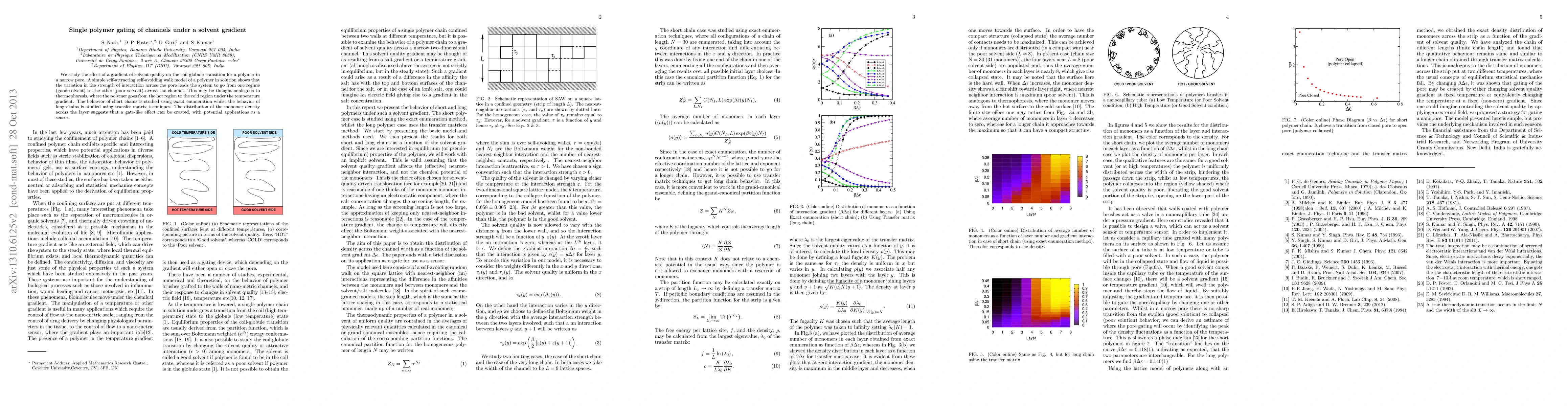 We study the effect of a gradient of solvent quality on the coil-globule transition for a polymer in a narrow pore. A simple self-attracting self-avoiding walk model of a polymer in solution shows that the variation in the strength of interaction across the pore leads the system to go from one regime (good solvent) to the other (poor solvent) across the channel. This may be thought analogous to thermophoresis, where the polymer goes from the hot region to the cold region under the temperature gradient. The behavior of short chains is studied using exact enumeration whilst the behavior of long chains is studied using transfer matrix techniques. The distribution of the monomer density across the layer suggests that a gate-like effect can be created, with potential applications as a sensor.