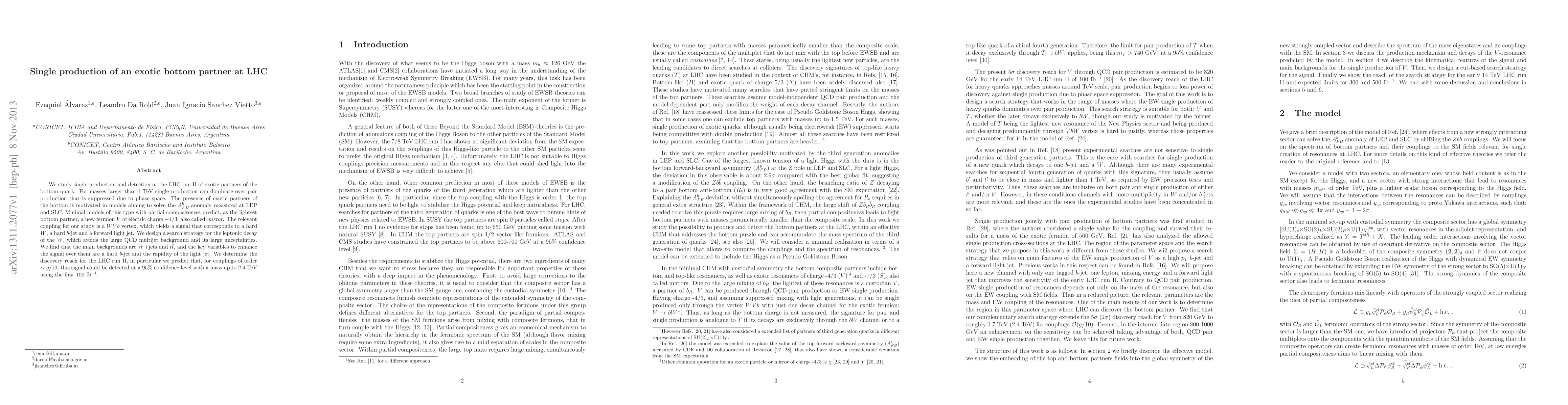 We study single production and detection at the LHC run II of exotic partners of the bottom quark. For masses larger than 1 TeV single production can dominate over pair production that is suppressed due to phase space. The presence of exotic partners of the bottom is motivated in models aiming to solve the $A_{FB}^b$ anomaly measured at LEP and SLC. Minimal models of this type with partial compositeness predict, as the lightest bottom partner, a new fermion V of electric charge -4/3, also called mirror. The relevant coupling for our study is a WVb vertex, which yields a signal that corresponds to a hard W, a hard b-jet and a forward light jet. We design a search strategy for the leptonic decay of the W, which avoids the large QCD multijet background and its large uncertainties. We find that the main backgrounds are W+jets and ttbar, and the key variables to enhance the signal over them are a hard b-jet and the rapidity of the light jet. We determine the discovery reach for the LHC run II, in particular we predict that, for couplings of order ~g/10, this signal could be detected at a 95% confidence level with a mass up to 2.4 TeV using the first 100 fb-1.