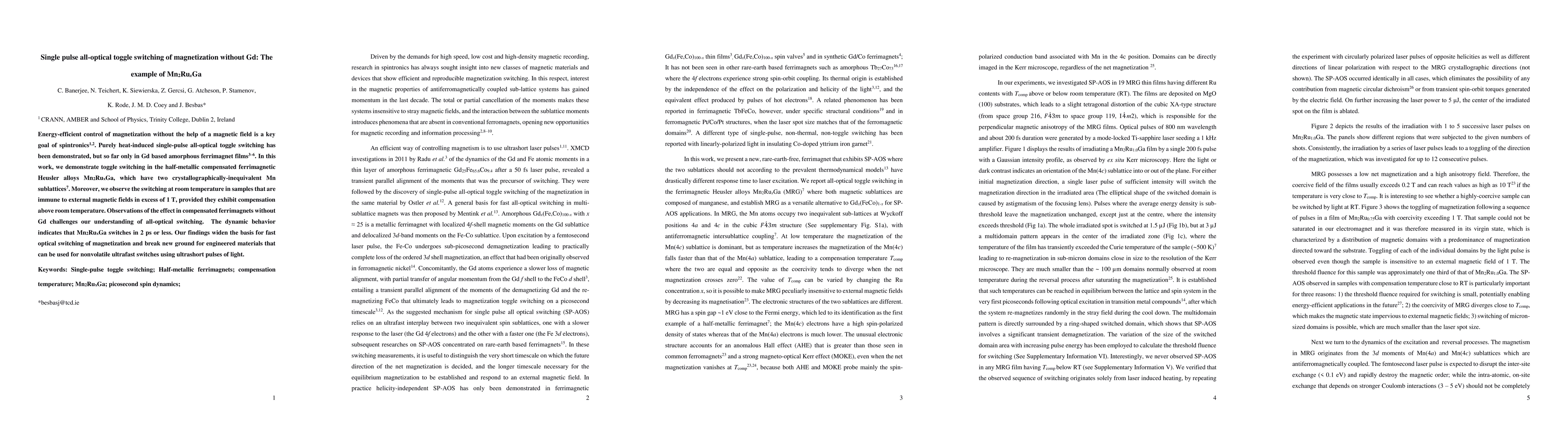 This paper demonstrates room-temperature, single-pulse all-optical toggle switching of magnetization in Mn2RuxGa Heusler alloys without the need for Gd, challenging existing models of all-optical switching and indicating a dynamic response of 2 ps or less. This discovery expands the potential for fast, nonvolatile optical switches using ultrashort light pulses.