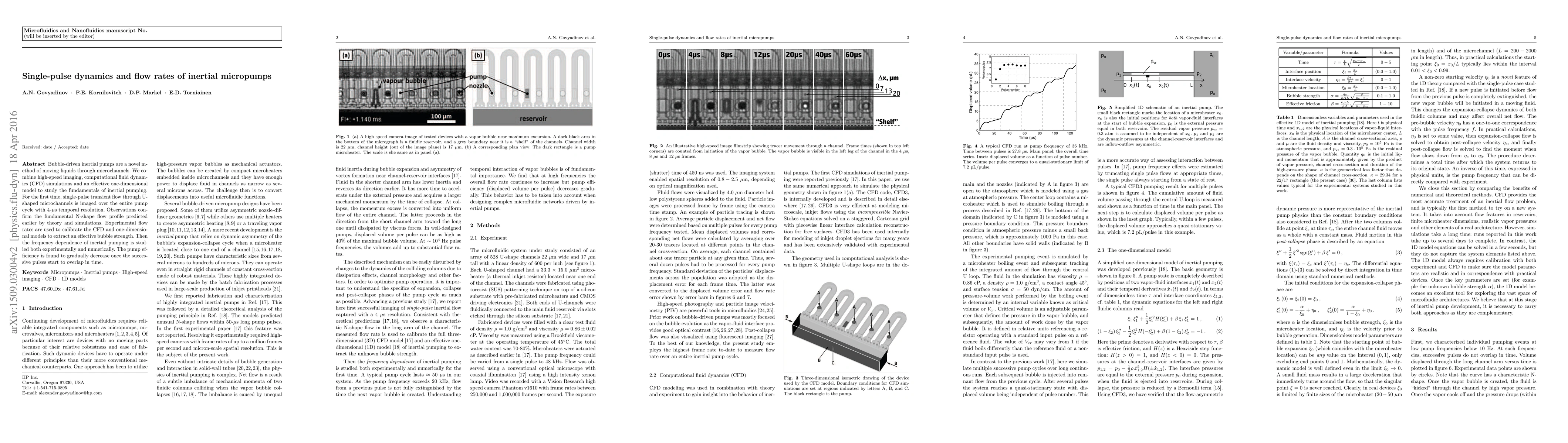 Bubble-driven inertial pumps are a novel method of moving liquids through microchannels. We combine high-speed imaging, computational fluid dynamics (CFD) simulations and an effective one-dimensional model to study the fundamentals of inertial pumping. For the first time, single-pulse transient flow through U-shaped microchannels is imaged over the entire pump cycle with 4-microsecond temporal resolution. Observations confirm the fundamental N-shape flow profile predicted earlier by theory and simulations. Experimental flow rates are used to calibrate the CFD and one-dimensional models to extract an effective bubble strength. Then the frequency dependence of inertial pumping is studied both experimentally and numerically. The pump efficiency is found to gradually decrease once the successive pulses start to overlap in time.