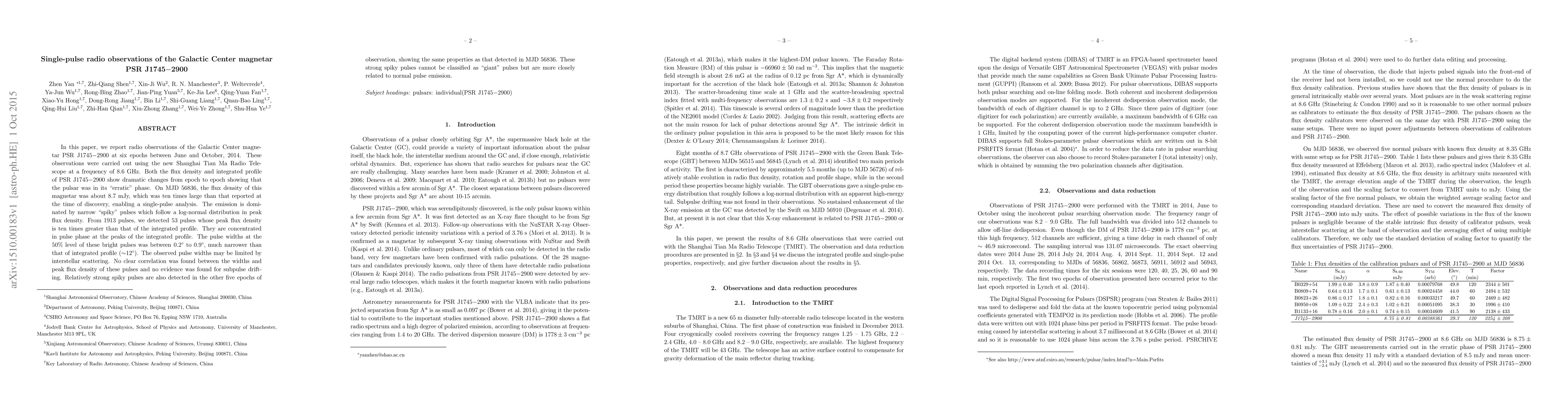 In this paper, we report radio observations of the Galactic Center magnetar PSR J1745-2900 at six epochs between June and October, 2014. These observations were carried out using the new Shanghai Tian Ma Radio Telescope at a frequency of 8.6 GHz. Both the flux density and integrated profile of PSR J1745-2900 show dramatic changes from epoch to epoch showing that the pulsar was in its "erratic" phase. On MJD 56836, the flux density of this magnetar was about 8.7 mJy, which was ten times large than that reported at the time of discovery, enabling a single-pulse analysis. The emission is dominated by narrow "spiky" pulses which follow a log-normal distribution in peak flux density. From 1913 pulses, we detected 53 pulses whose peak flux density is ten times greater than that of the integrated profile. They are concentrated in pulse phase at the peaks of the integrated profile. The pulse widths at the 50% level of these bright pulses was between 0.2 to 0.9 deg, much narrower than that of integrated profile (~12 deg). The observed pulse widths may be limited by interstellar scattering. No clear correlation was found between the widths and peak flux density of these pulses and no evidence was found for subpulse drifting. Relatively strong spiky pulses are also detected in the other five epochs of observation, showing the same properties as that detected in MJD 56836. These strong spiky pulses cannot be classified as "giant" pulses but are more closely related to normal pulse emission.