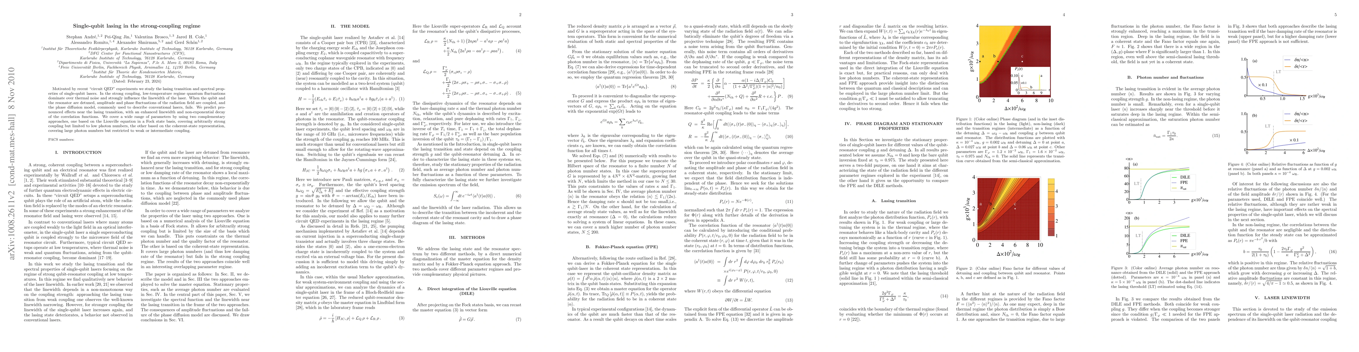 This paper investigates the lasing transition and spectral properties of single-qubit lasers in the strong-coupling regime, where quantum fluctuations dominate. It predicts enhanced linewidth and non-exponential decay near the lasing transition, using two complementary theoretical approaches for different coupling strengths and photon numbers.
