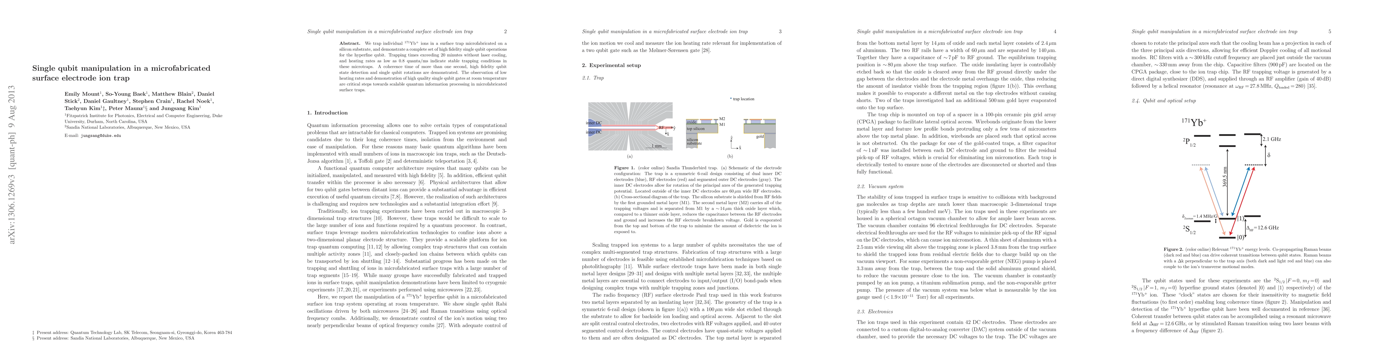 This paper details the trapping of individual $^{171}$Yb$^+$ ions in a microfabricated surface electrode ion trap, showcasing high fidelity single qubit operations, stable trapping conditions, and a coherence time exceeding one second. The study reports trapping times over 20 minutes and heating rates as low as 0.8(0.1) quanta/ms.