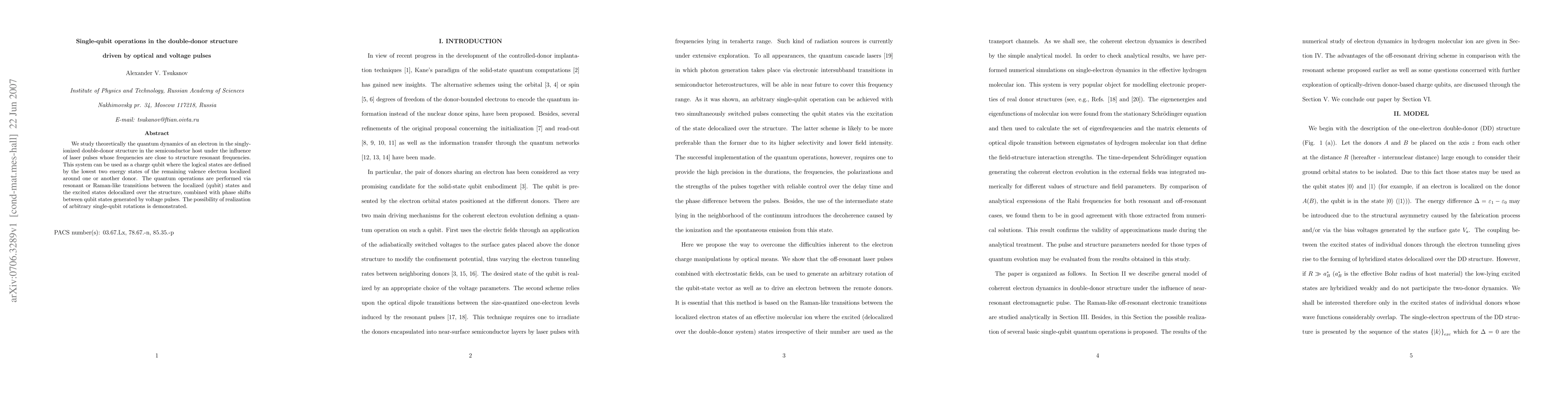 This paper theoretically investigates the quantum dynamics of an electron in a double-donor structure in a semiconductor, driven by laser and voltage pulses. It demonstrates the feasibility of single-qubit operations using resonant transitions and phase shifts, showcasing the potential for arbitrary single-qubit rotations in a charge qubit system.
