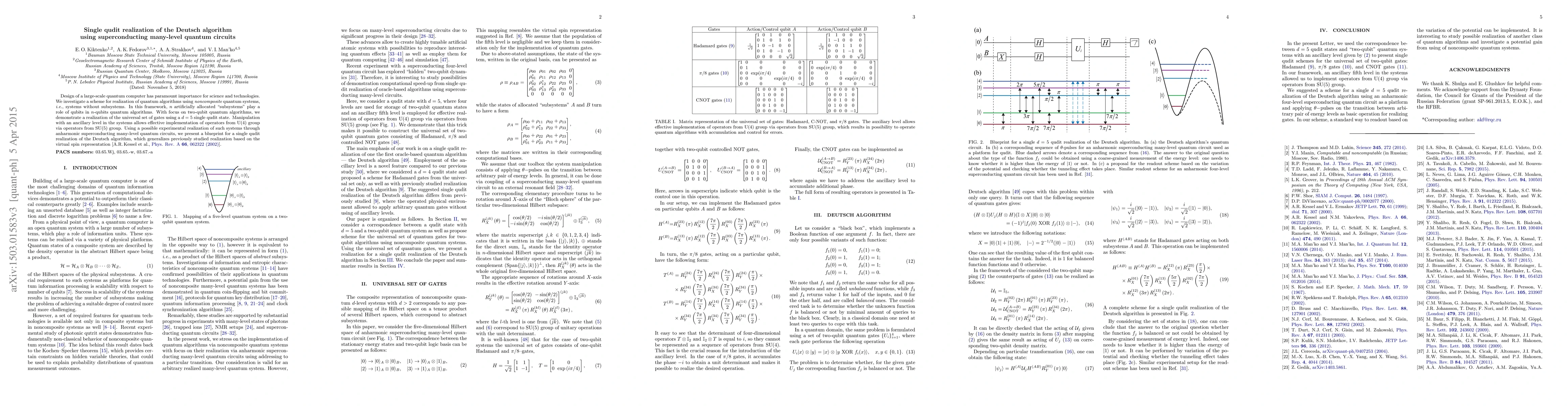This paper proposes a scheme for implementing quantum algorithms using a single qudit state in superconducting many-level circuits, demonstrating the realization of universal quantum gates and the Deutsch algorithm with a $d=5$ qudit. The approach utilizes an ancillary level to manipulate operators from ${\rm U}(4)$ via ${\rm SU}(5)$ group operations.