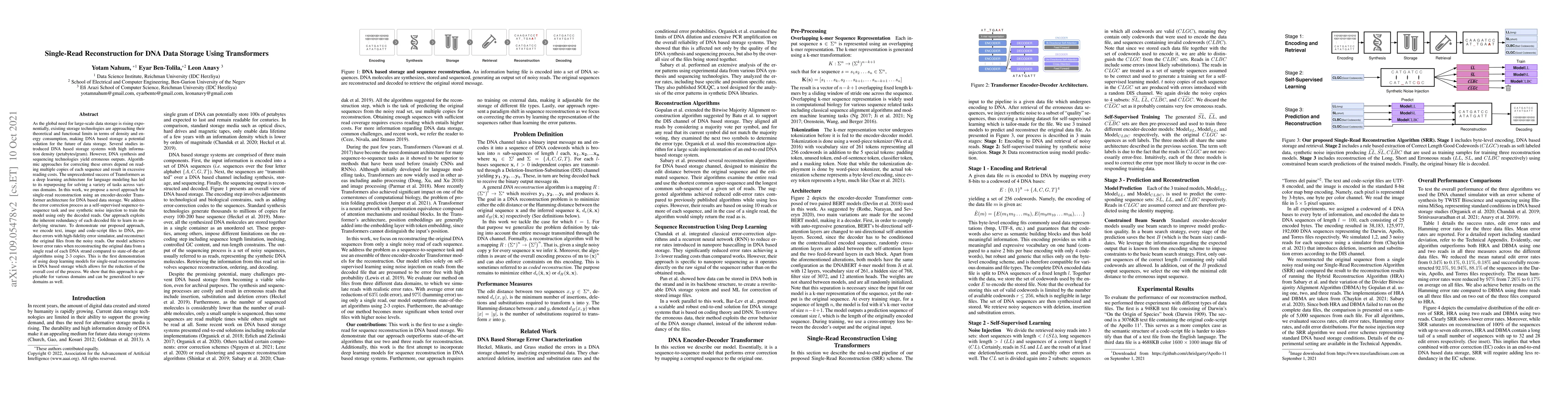 As the global need for large-scale data storage is rising exponentially, existing storage technologies are approaching their theoretical and functional limits in terms of density and energy consumption, making DNA based storage a potential solution for the future of data storage. Several studies introduced DNA based storage systems with high information density (petabytes/gram). However, DNA synthesis and sequencing technologies yield erroneous outputs. Algorithmic approaches for correcting these errors depend on reading multiple copies of each sequence and result in excessive reading costs. The unprecedented success of Transformers as a deep learning architecture for language modeling has led to its repurposing for solving a variety of tasks across various domains. In this work, we propose a novel approach for single-read reconstruction using an encoder-decoder Transformer architecture for DNA based data storage. We address the error correction process as a self-supervised sequence-to-sequence task and use synthetic noise injection to train the model using only the decoded reads. Our approach exploits the inherent redundancy of each decoded file to learn its underlying structure. To demonstrate our proposed approach, we encode text, image and code-script files to DNA, produce errors with high-fidelity error simulator, and reconstruct the original files from the noisy reads. Our model achieves lower error rates when reconstructing the original data from a single read of each DNA strand compared to state-of-the-art algorithms using 2-3 copies. This is the first demonstration of using deep learning models for single-read reconstruction in DNA based storage which allows for the reduction of the overall cost of the process. We show that this approach is applicable for various domains and can be generalized to new domains as well.