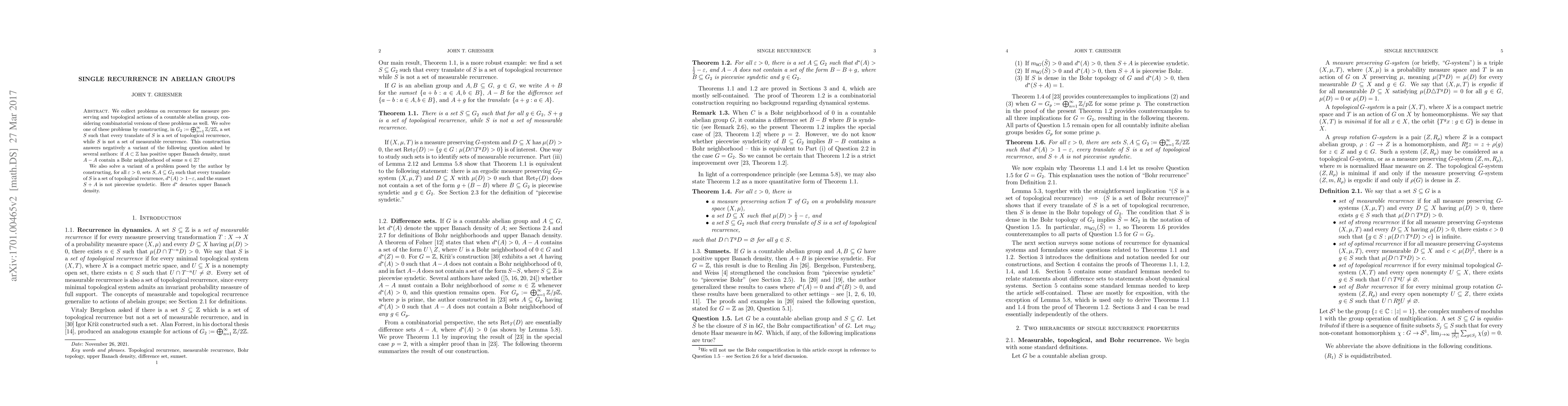 This research paper solves a problem in abelian groups regarding recurrence and provides a construction that shows certain sets can have topological recurrence without being measurable recurrence, with implications for the study of set theory and number theory.