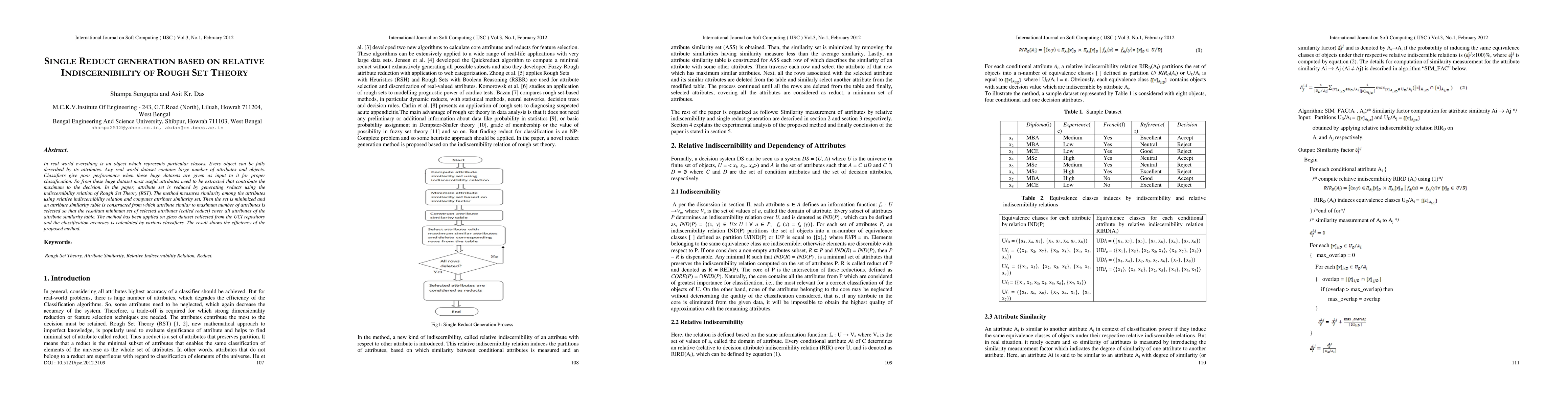 This paper proposes a method for reducing attribute sets in large datasets using the relative indiscernibility relation of Rough Set Theory to generate reducts, which are minimal sets of attributes that maintain classification accuracy. The method was tested on a glass dataset, demonstrating improved classifier performance.
