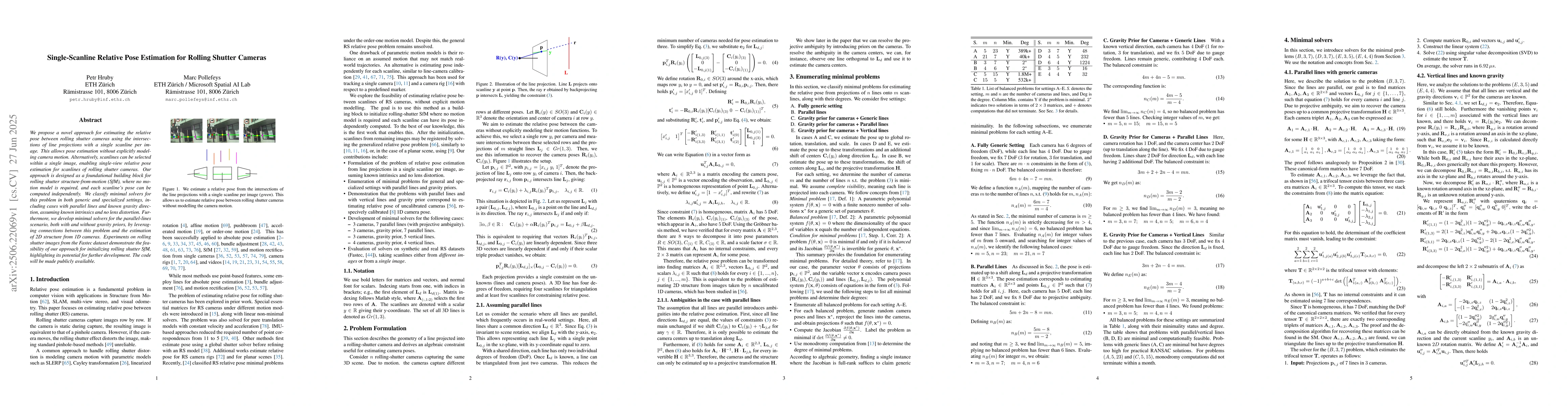 We propose a novel approach for estimating the relative pose between rolling shutter cameras using the intersections of line projections with a single scanline per image. This allows pose estimation without explicitly modeling camera motion. Alternatively, scanlines can be selected within a single image, enabling single-view relative pose estimation for scanlines of rolling shutter cameras. Our approach is designed as a foundational building block for rolling shutter structure-from-motion (SfM), where no motion model is required, and each scanline's pose can be computed independently. % We classify minimal solvers for this problem in both generic and specialized settings, including cases with parallel lines and known gravity direction, assuming known intrinsics and no lens distortion. Furthermore, we develop minimal solvers for the parallel-lines scenario, both with and without gravity priors, by leveraging connections between this problem and the estimation of 2D structure from 1D cameras. % Experiments on rolling shutter images from the Fastec dataset demonstrate the feasibility of our approach for initializing rolling shutter SfM, highlighting its potential for further development. % The code will be made publicly available.