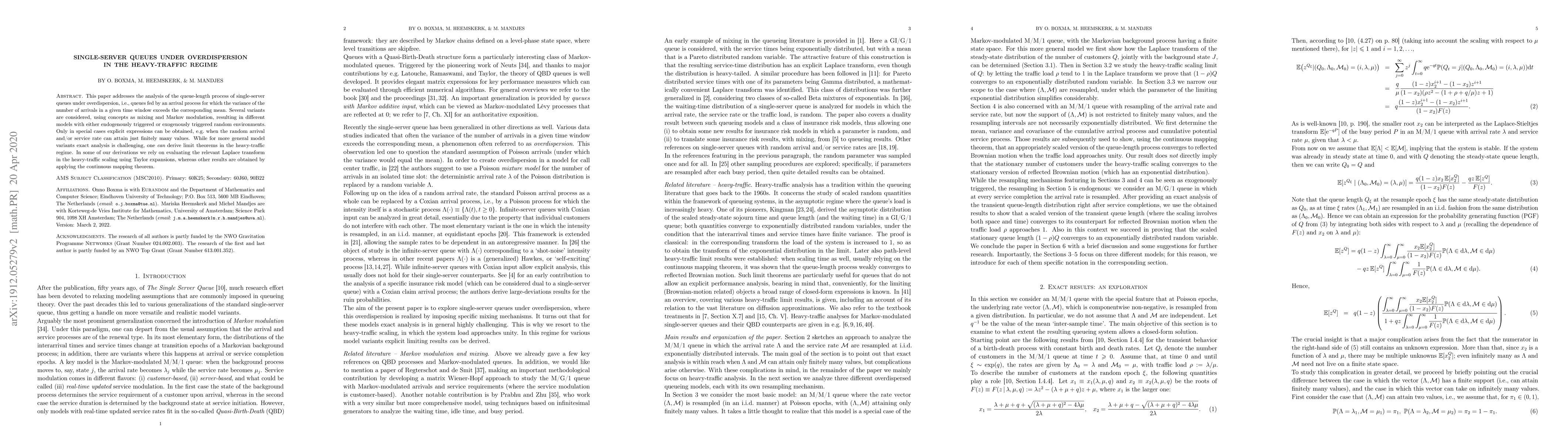 The paper presents a detailed analysis of single-server queues under overdispersion in the heavy-traffic regime, deriving limit theorems and characterizing the asymptotic behavior of queue lengths for both endogenous and exogenous resampling models.