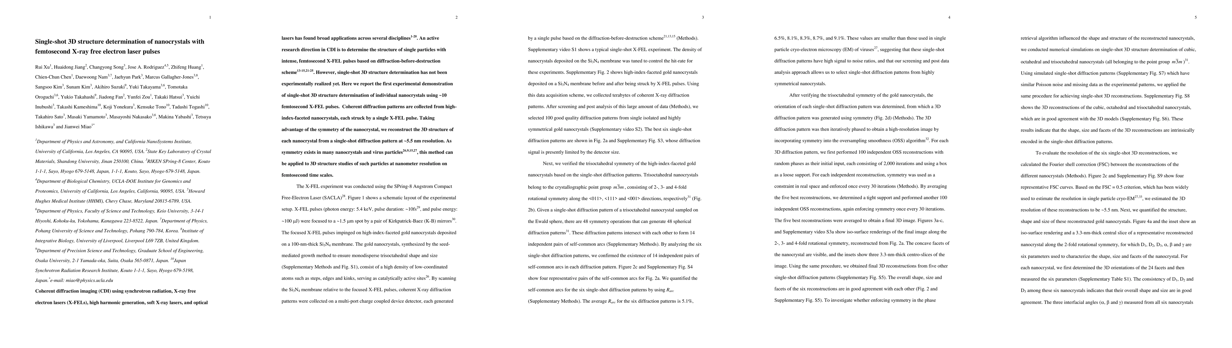 This paper reports the first experimental realization of single-shot 3D structure determination of nanocrystals using ~10 femtosecond X-FEL pulses, achieving ~5.5 nm resolution. The method leverages nanocrystal symmetry to reconstruct 3D structures from single-shot diffraction patterns, enabling nanometer-scale studies on femtosecond timescales.