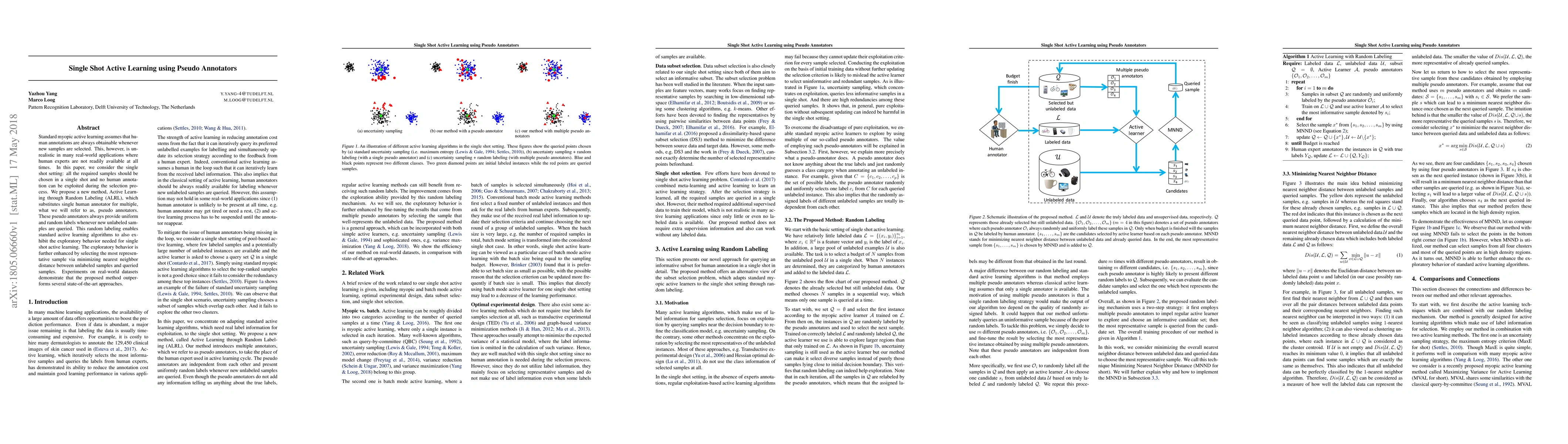 Standard myopic active learning assumes that human annotations are always obtainable whenever new samples are selected. This, however, is unrealistic in many real-world applications where human experts are not readily available at all times. In this paper, we consider the single shot setting: all the required samples should be chosen in a single shot and no human annotation can be exploited during the selection process. We propose a new method, Active Learning through Random Labeling (ALRL), which substitutes single human annotator for multiple, what we will refer to as, pseudo annotators. These pseudo annotators always provide uniform and random labels whenever new unlabeled samples are queried. This random labeling enables standard active learning algorithms to also exhibit the exploratory behavior needed for single shot active learning. The exploratory behavior is further enhanced by selecting the most representative sample via minimizing nearest neighbor distance between unlabeled samples and queried samples. Experiments on real-world datasets demonstrate that the proposed method outperforms several state-of-the-art approaches.