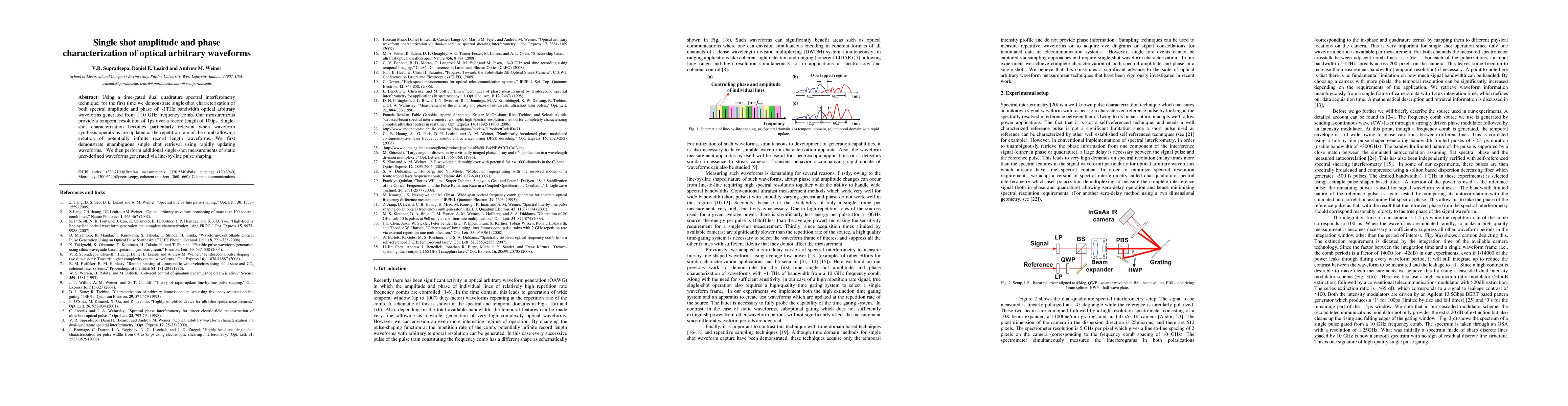 This paper presents a novel time-gated dual quadrature spectral interferometry technique for single-shot characterization of both amplitude and phase of ~1 THz bandwidth optical arbitrary waveforms, achieving 1 ps temporal resolution over 100 ps. The method enables the retrieval of rapidly updating waveforms at the frequency comb's repetition rate, demonstrating its potential for dynamic waveform synthesis.