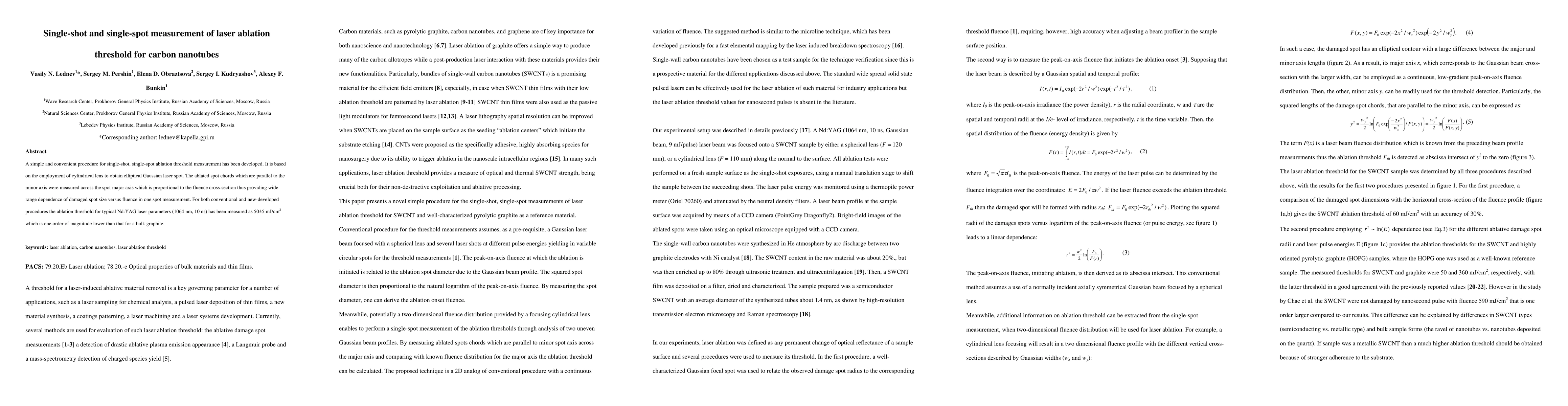 A simple and convenient procedure for single-shot, single-spot ablation threshold measurement has been developed. It is based on the employment of cylindrical lens to obtain elliptical Gaussian laser spot. The ablated spot chords which are parallel to the minor axis were measured across the spot major axis which is proportional to the fluence cross-section thus providing wide range dependence of damaged spot size versus fluence in one spot measurement. For both conventional and new-developed procedures the ablation threshold for typical Nd:YAG laser parameters (1064 nm, 10 ns) has been measured as 50 mJ/cm2 which is one order of magnitude lower than that for a bulk graphite.