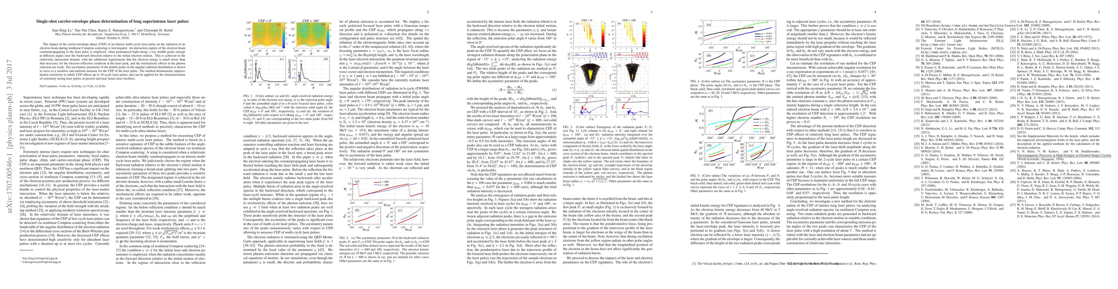 This paper investigates the effect of the carrier-envelope phase (CEP) on electron beam radiation in nonlinear Compton scattering using long superintense laser pulses. The asymmetry parameter of high-energy x-ray double peaks serves as a precise measure for CEP determination, demonstrating high sensitivity for characterizing extremely strong laser pulses.