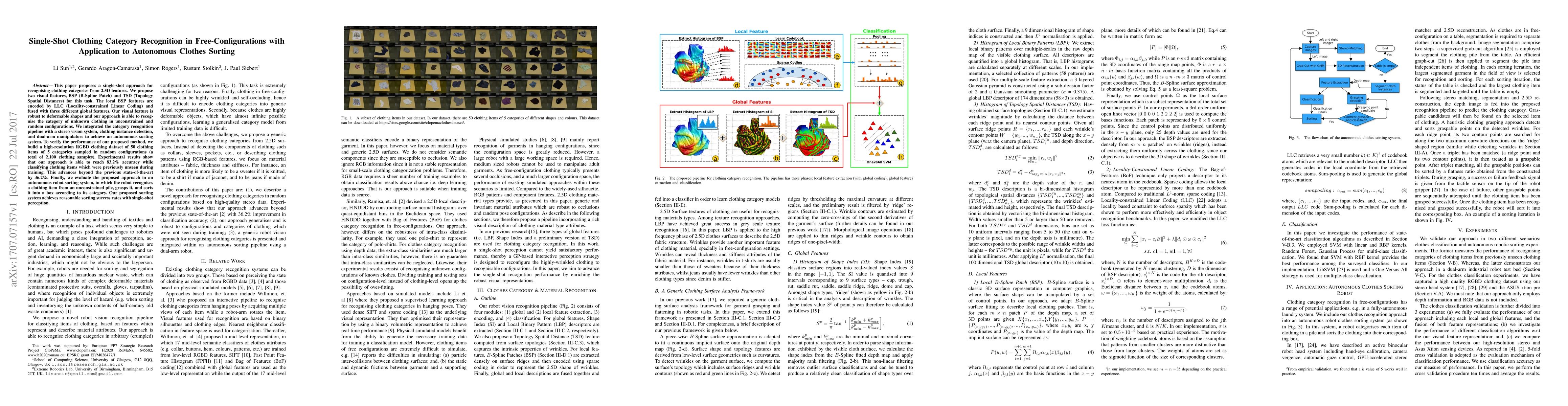 This paper proposes a single-shot approach for recognising clothing categories from 2.5D features. We propose two visual features, BSP (B-Spline Patch) and TSD (Topology Spatial Distances) for this task. The local BSP features are encoded by LLC (Locality-constrained Linear Coding) and fused with three different global features. Our visual feature is robust to deformable shapes and our approach is able to recognise the category of unknown clothing in unconstrained and random configurations. We integrated the category recognition pipeline with a stereo vision system, clothing instance detection, and dual-arm manipulators to achieve an autonomous sorting system. To verify the performance of our proposed method, we build a high-resolution RGBD clothing dataset of 50 clothing items of 5 categories sampled in random configurations (a total of 2,100 clothing samples). Experimental results show that our approach is able to reach 83.2\% accuracy while classifying clothing items which were previously unseen during training. This advances beyond the previous state-of-the-art by 36.2\%. Finally, we evaluate the proposed approach in an autonomous robot sorting system, in which the robot recognises a clothing item from an unconstrained pile, grasps it, and sorts it into a box according to its category. Our proposed sorting system achieves reasonable sorting success rates with single-shot perception.