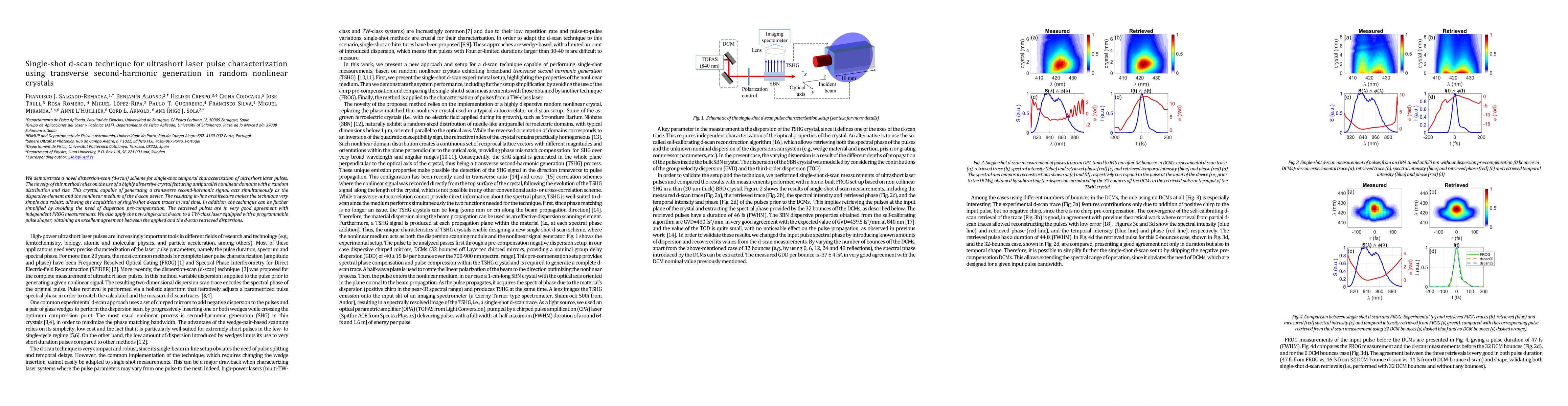 This paper introduces a novel single-shot d-scan technique for real-time characterization of ultrashort laser pulses using transverse second-harmonic generation in random nonlinear crystals, which simplifies the setup and eliminates the need for dispersion pre-compensation, showing good agreement with independent FROG measurements.