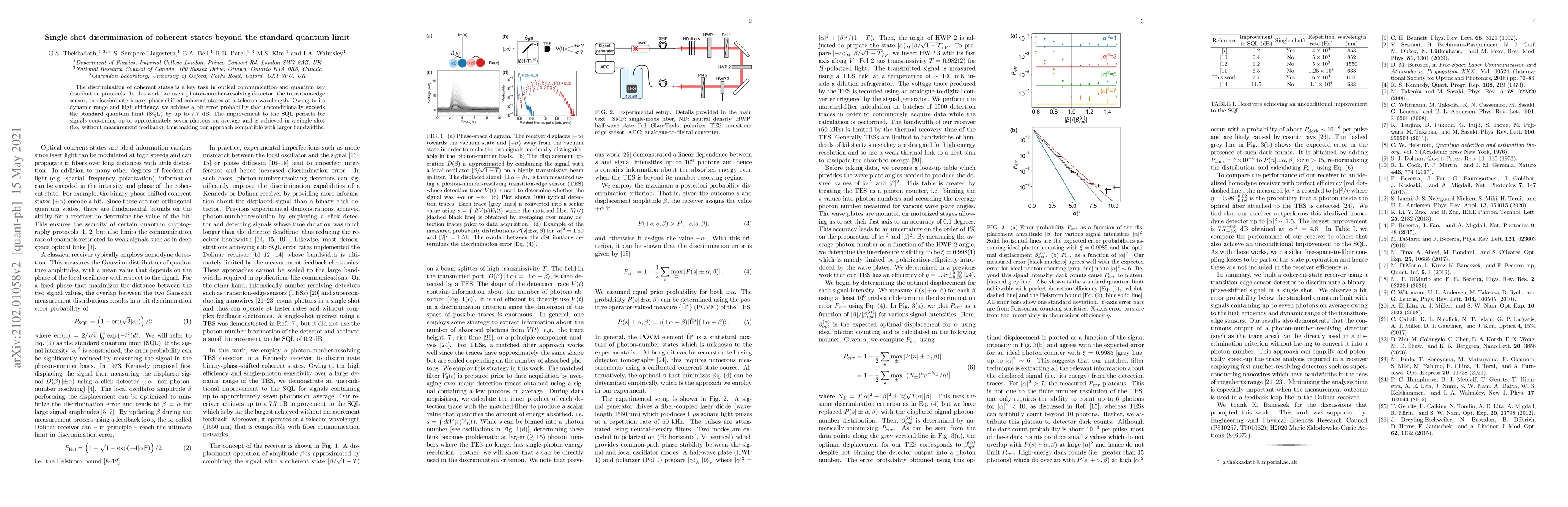 This paper presents a method using a photon-number-resolving detector to achieve single-shot discrimination of coherent states that exceeds the standard quantum limit by up to 7.7 dB, suitable for optical communication and quantum key distribution. The technique works without measurement feedback, maintaining compatibility with larger bandwidths.
