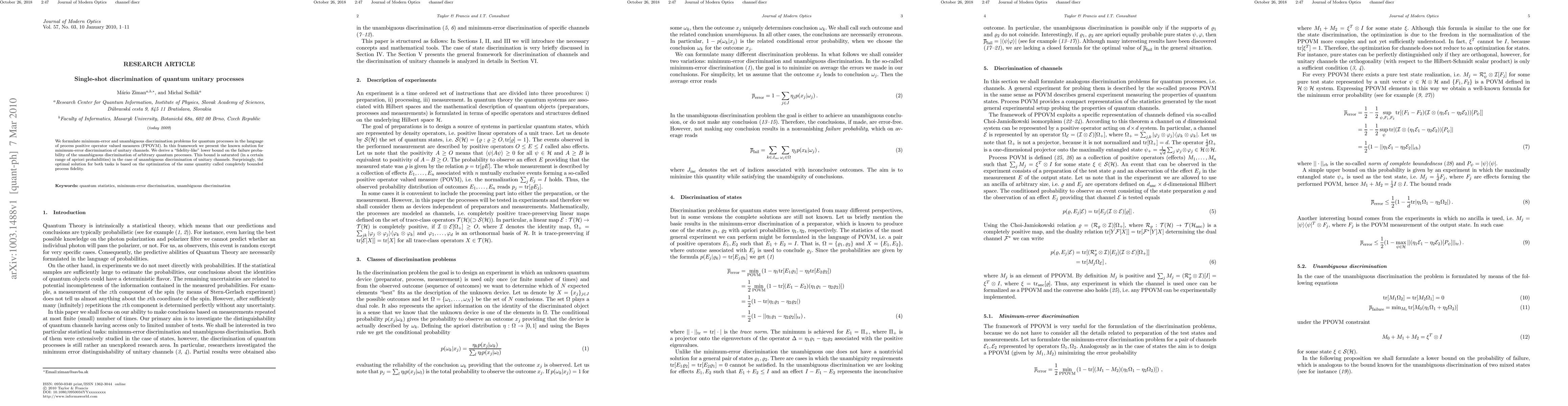 This paper formulates and solves minimum-error and unambiguous discrimination problems for quantum unitary processes using process positive operator valued measures (PPOVM). It introduces a "fidelity-like" lower bound for unambiguous discrimination, which is optimal for unitary channels, revealing that both discrimination tasks are optimized using the completely bounded process fidelity.