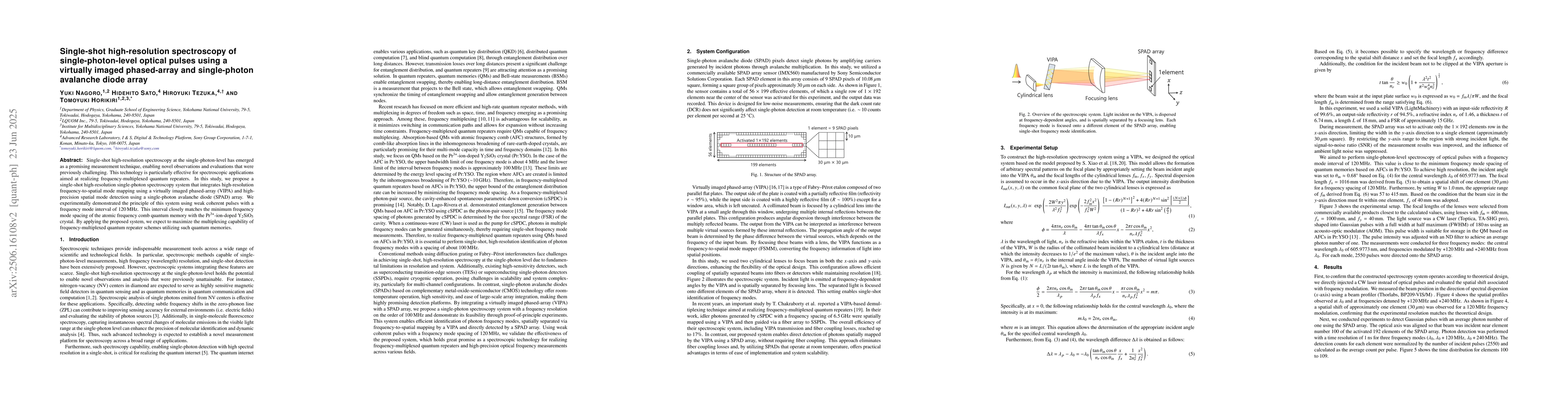 Single-shot high-resolution spectroscopy at the single-photon-level has emerged as a promising measurement technique, enabling novel observations and evaluations that were previously challenging. This technology is particularly effective for spectroscopic applications aimed at realizing frequency-multiplexed quantum repeaters. In this study, we propose a single-shot high-resolution single-photon spectroscopy system that integrates high-resolution frequency-to-spatial mode mapping using a virtually imaged phased-array (VIPA) and high-precision spatial mode detection using a single-photon avalanche diode (SPAD) array. We experimentally demonstrated the principle of this system using weak coherent pulses with a frequency mode interval of 120 MHz. This interval closely matches the minimum frequency mode spacing of the atomic frequency comb quantum memory with the Pr$^{3+}$-ion-doped Y$_2$SiO$_5$ crystal. By applying the proposed system, we expect to maximize the multiplexing capability of frequency-multiplexed quantum repeater schemes utilizing such quantum memories.