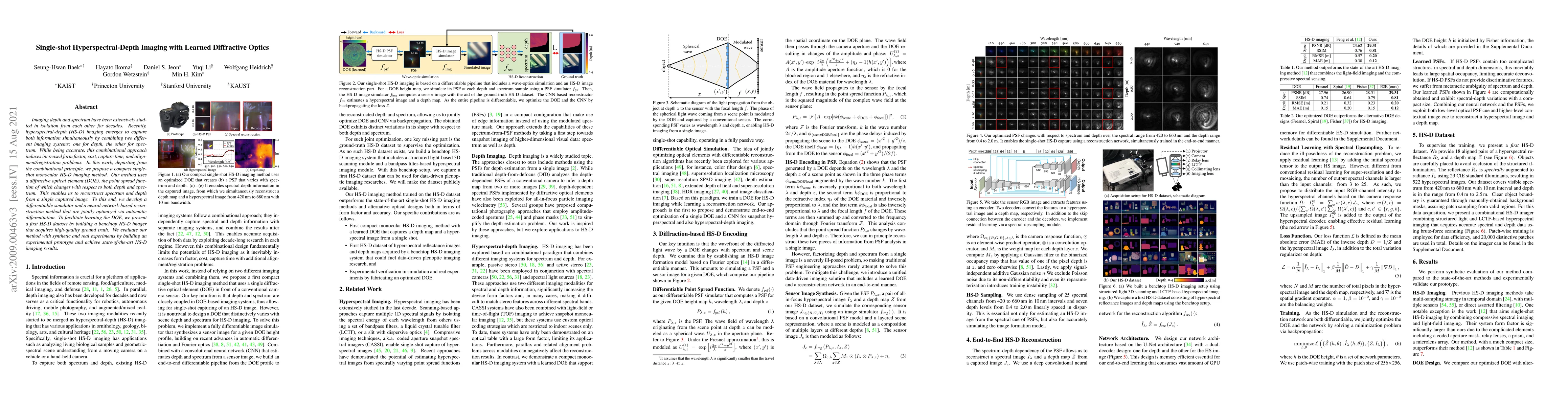 This paper proposes a novel single-shot hyperspectral-depth imaging method using a diffractive optical element (DOE) that captures both depth and spectral information in one image. The method employs a differentiable simulator and neural network optimization to reconstruct the data, achieving state-of-the-art results with reduced form factor and cost.