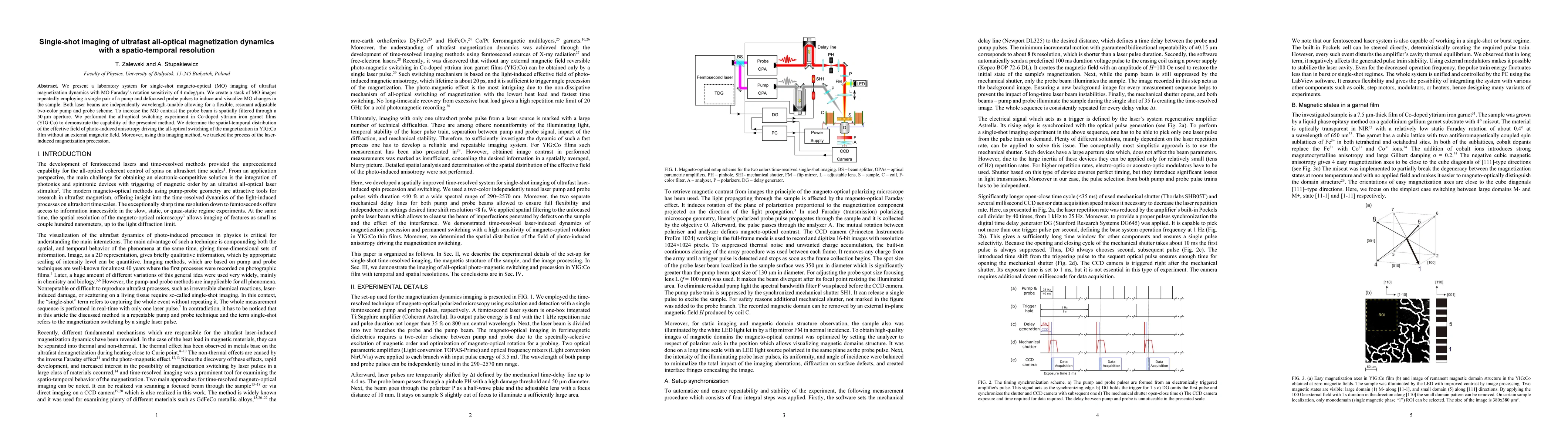 This paper presents a laboratory system for single-shot imaging of ultrafast magnetization dynamics in Co-doped yttrium iron garnet films using a flexible, resonant two-color pump and probe scheme. The method enables tracking of laser-induced magnetization precession and the spatial-temporal distribution of the effective field driving the all-optical switching.