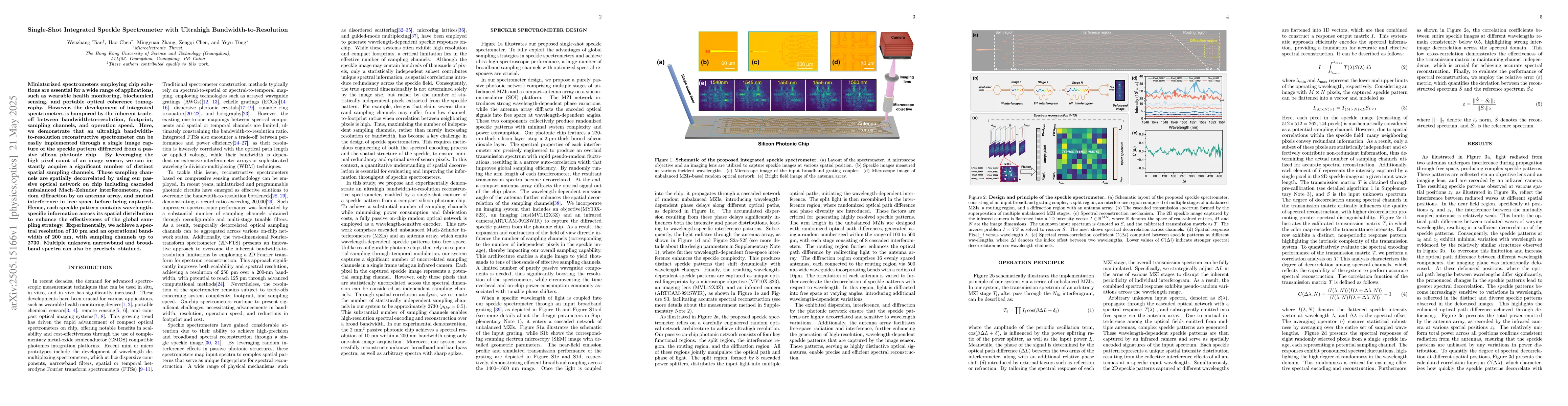 The research demonstrates an ultrahigh bandwidth-to-resolution spectrometer using a single-shot integrated speckle pattern captured by an image sensor from a passive silicon photonic chip, employing cascaded unbalanced Mach-Zehnder interferometers, random diffraction by an antenna array, and free-space mutual interference.