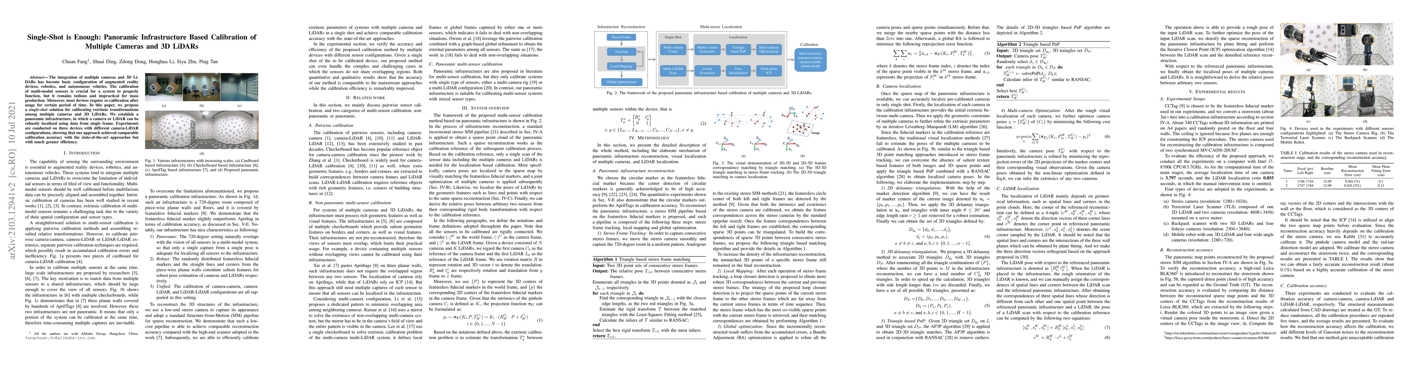 The integration of multiple cameras and 3D Li- DARs has become basic configuration of augmented reality devices, robotics, and autonomous vehicles. The calibration of multi-modal sensors is crucial for a system to properly function, but it remains tedious and impractical for mass production. Moreover, most devices require re-calibration after usage for certain period of time. In this paper, we propose a single-shot solution for calibrating extrinsic transformations among multiple cameras and 3D LiDARs. We establish a panoramic infrastructure, in which a camera or LiDAR can be robustly localized using data from single frame. Experiments are conducted on three devices with different camera-LiDAR configurations, showing that our approach achieved comparable calibration accuracy with the state-of-the-art approaches but with much greater efficiency.