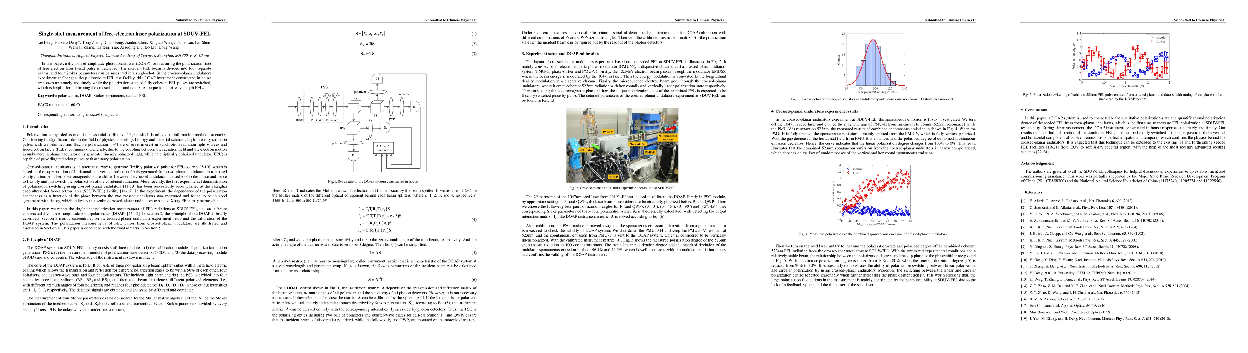 This paper introduces a division-of-amplitude photopolarimeter (DOAP) for single-shot measurement of free-electron laser (FEL) polarization, demonstrating accurate and timely responses in experiments at the Shanghai deep ultraviolet FEL test facility. The DOAP measures four Stokes parameters, aiding in confirming the crossed-planar undulators technique for short-wavelength FELs.