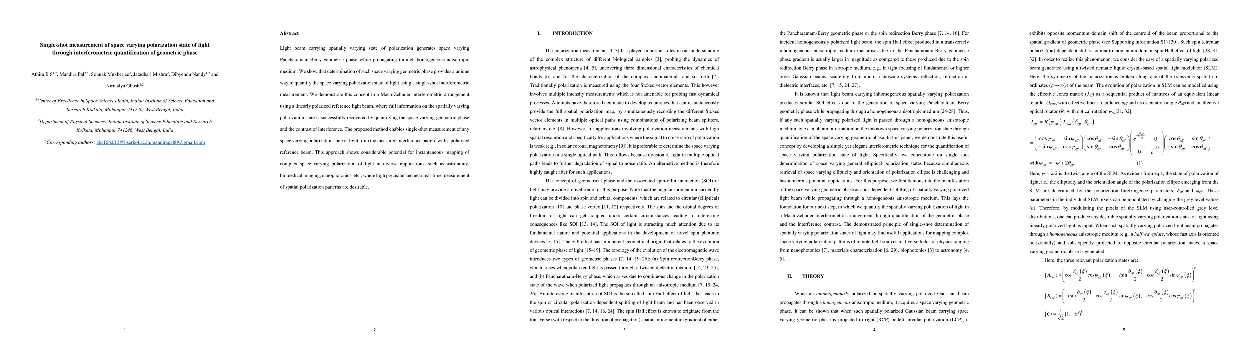 This paper proposes a method for single-shot measurement of the space varying polarization state of light by quantifying the associated geometric phase through interferometric techniques. The method uses a Mach-Zehnder interferometer with a polarized reference beam to achieve precise and instantaneous mapping of complex polarization states.