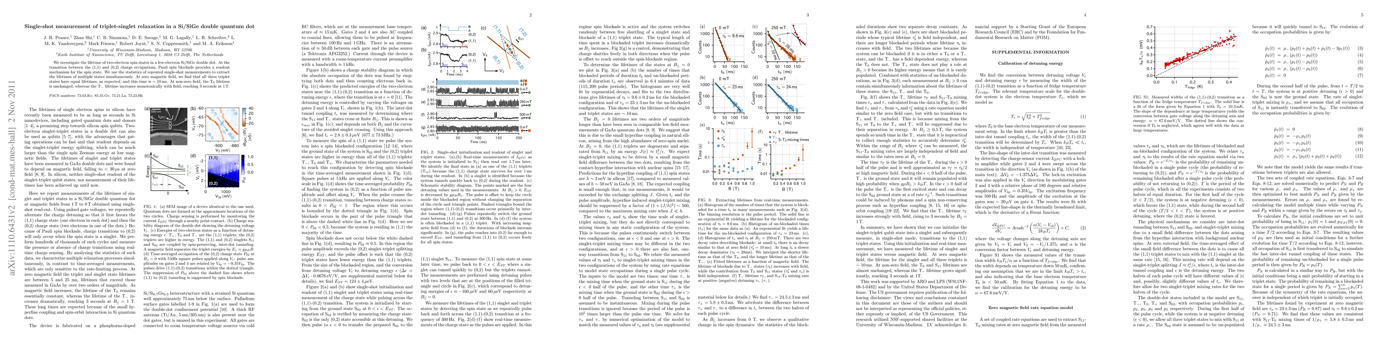 This study measures the lifetimes of spin states in a Si/SiGe double quantum dot using single-shot techniques, revealing equal triplet state lifetimes (~10 ms) at zero magnetic field and a field-dependent increase in the T- state lifetime to 3 seconds at 1 T. The Pauli spin blockade mechanism is utilized for spin state readout.