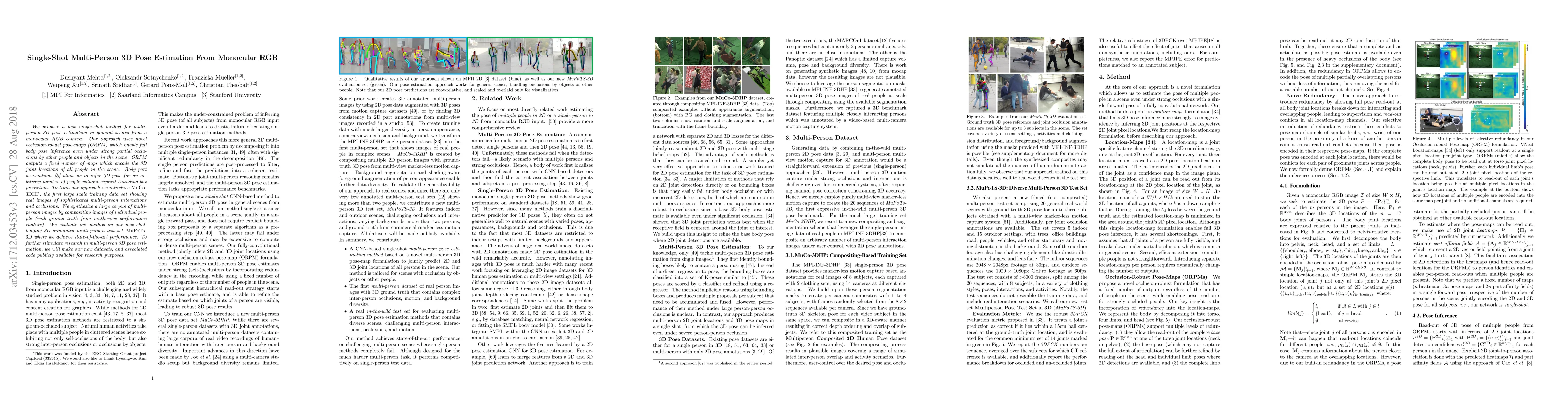 We propose a new single-shot method for multi-person 3D pose estimation in general scenes from a monocular RGB camera. Our approach uses novel occlusion-robust pose-maps (ORPM) which enable full body pose inference even under strong partial occlusions by other people and objects in the scene. ORPM outputs a fixed number of maps which encode the 3D joint locations of all people in the scene. Body part associations allow us to infer 3D pose for an arbitrary number of people without explicit bounding box prediction. To train our approach we introduce MuCo-3DHP, the first large scale training data set showing real images of sophisticated multi-person interactions and occlusions. We synthesize a large corpus of multi-person images by compositing images of individual people (with ground truth from mutli-view performance capture). We evaluate our method on our new challenging 3D annotated multi-person test set MuPoTs-3D where we achieve state-of-the-art performance. To further stimulate research in multi-person 3D pose estimation, we will make our new datasets, and associated code publicly available for research purposes.