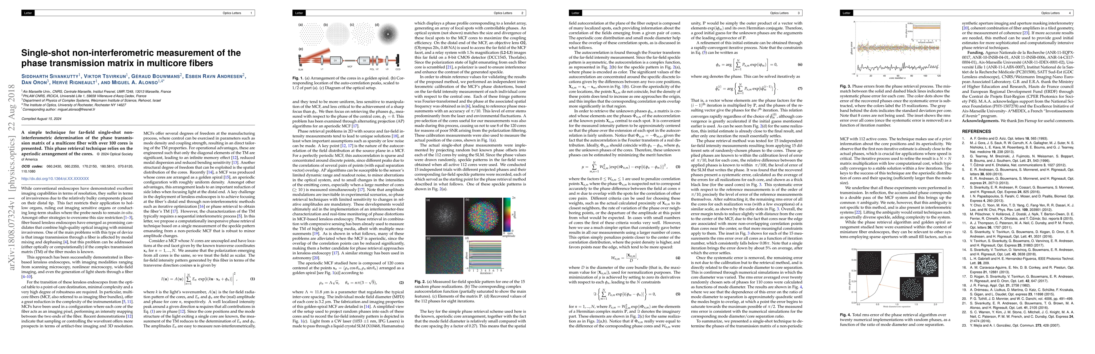 Summary: This paper introduces a straightforward method for single-shot, non-interferometric measurement of the phase transmission matrix in multicore fibers, utilizing the aperiodic core arrangement to achieve accurate phase retrieval. The technique is applicable to fibers with over 100 cores.