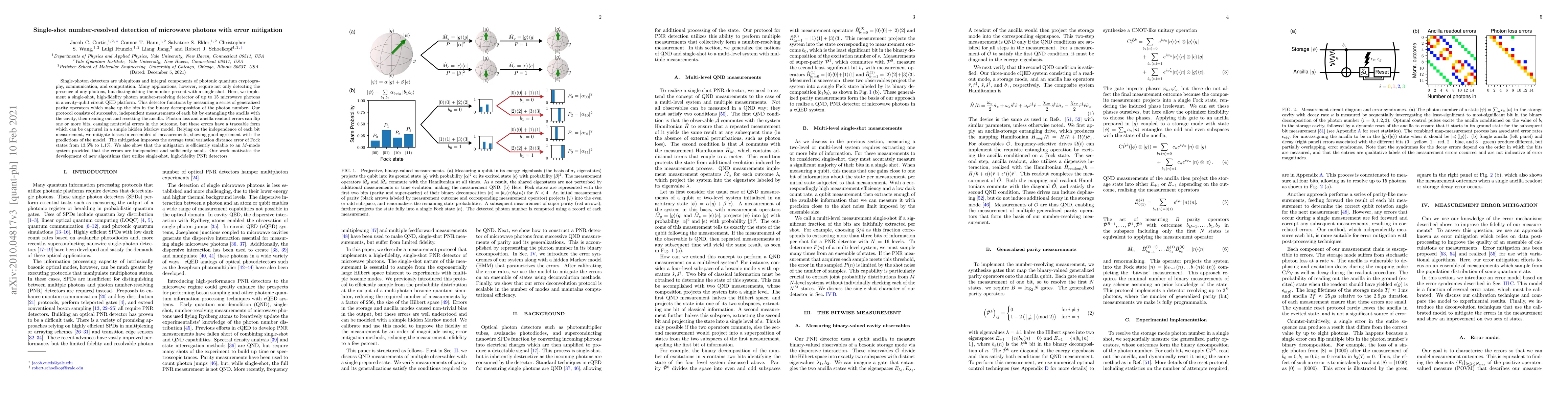 Single-photon detectors are ubiquitous and integral components of photonic quantum cryptography, communication, and computation. Many applications, however, require not only detecting the presence of any photons, but distinguishing the number present with a single shot. Here, we implement a single-shot, high-fidelity photon number-resolving detector of up to 15 microwave photons in a cavity-qubit circuit QED platform. This detector functions by measuring a series of generalized parity operators which make up the bits in the binary decomposition of the photon number. Our protocol consists of successive, independent measurements of each bit by entangling the ancilla with the cavity, then reading out and resetting the ancilla. Photon loss and ancilla readout errors can flip one or more bits, causing nontrivial errors in the outcome, but these errors have a traceable form which can be captured in a simple hidden Markov model. Relying on the independence of each bit measurement, we mitigate biases in ensembles of measurements, showing good agreement with the predictions of the model. The mitigation improves the average total variation distance error of Fock states from $13.5\%$ to $1.1\%$. We also show that the mitigation is efficiently scalable to an $M$-mode system provided that the errors are independent and sufficiently small. Our work motivates the development of new algorithms that utilize single-shot, high-fidelity PNR detectors.