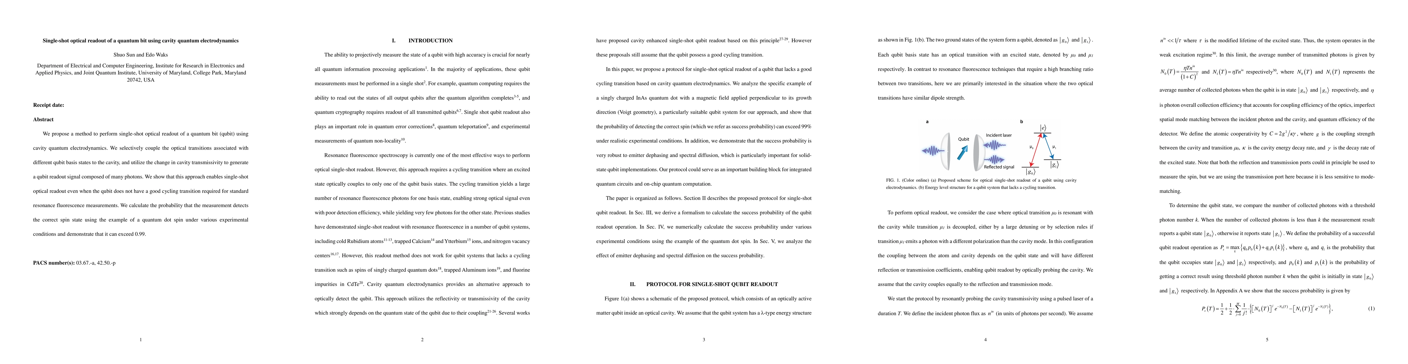 This research proposes a method for single-shot optical readout of qubits using cavity quantum electrodynamics, coupling optical transitions to a cavity to measure qubit states without requiring a cycling transition, achieving a high probability of correct state detection.