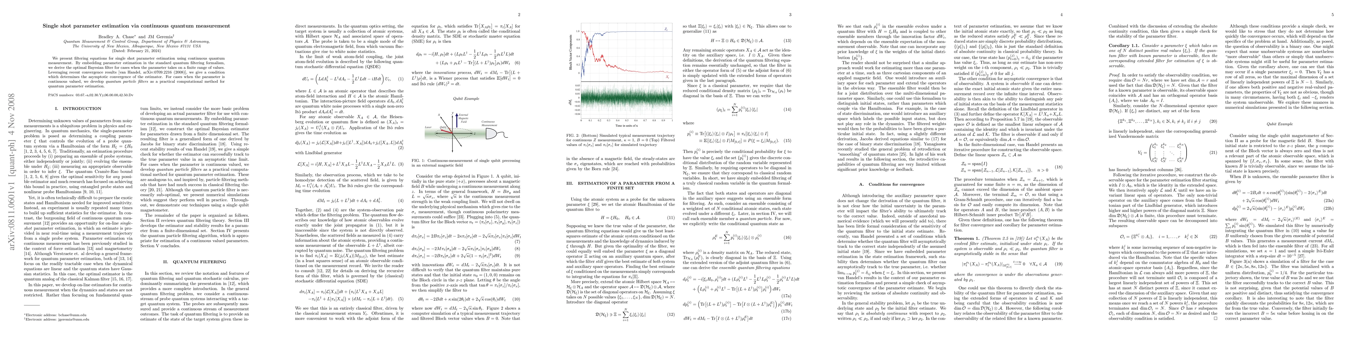 This paper develops filtering equations for single shot parameter estimation using continuous quantum measurement, deriving the optimal Bayesian filter for finite parameter ranges and quantum particle filters for continuous parameters. It also provides conditions for the asymptotic convergence of the estimator.