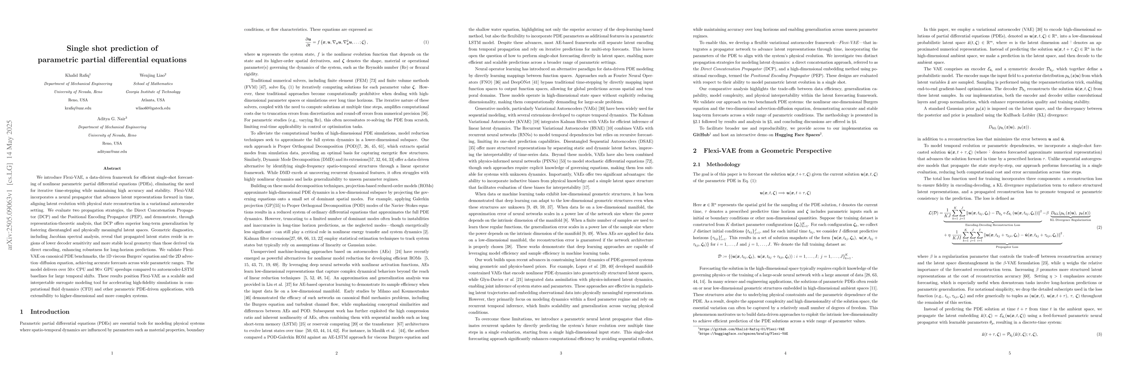 We introduce Flexi-VAE, a data-driven framework for efficient single-shot forecasting of nonlinear parametric partial differential equations (PDEs), eliminating the need for iterative time-stepping while maintaining high accuracy and stability. Flexi-VAE incorporates a neural propagator that advances latent representations forward in time, aligning latent evolution with physical state reconstruction in a variational autoencoder setting. We evaluate two propagation strategies, the Direct Concatenation Propagator (DCP) and the Positional Encoding Propagator (PEP), and demonstrate, through representation-theoretic analysis, that DCP offers superior long-term generalization by fostering disentangled and physically meaningful latent spaces. Geometric diagnostics, including Jacobian spectral analysis, reveal that propagated latent states reside in regions of lower decoder sensitivity and more stable local geometry than those derived via direct encoding, enhancing robustness for long-horizon predictions. We validate Flexi-VAE on canonical PDE benchmarks, the 1D viscous Burgers equation and the 2D advection-diffusion equation, achieving accurate forecasts across wide parametric ranges. The model delivers over 50x CPU and 90x GPU speedups compared to autoencoder-LSTM baselines for large temporal shifts. These results position Flexi-VAE as a scalable and interpretable surrogate modeling tool for accelerating high-fidelity simulations in computational fluid dynamics (CFD) and other parametric PDE-driven applications, with extensibility to higher-dimensional and more complex systems.