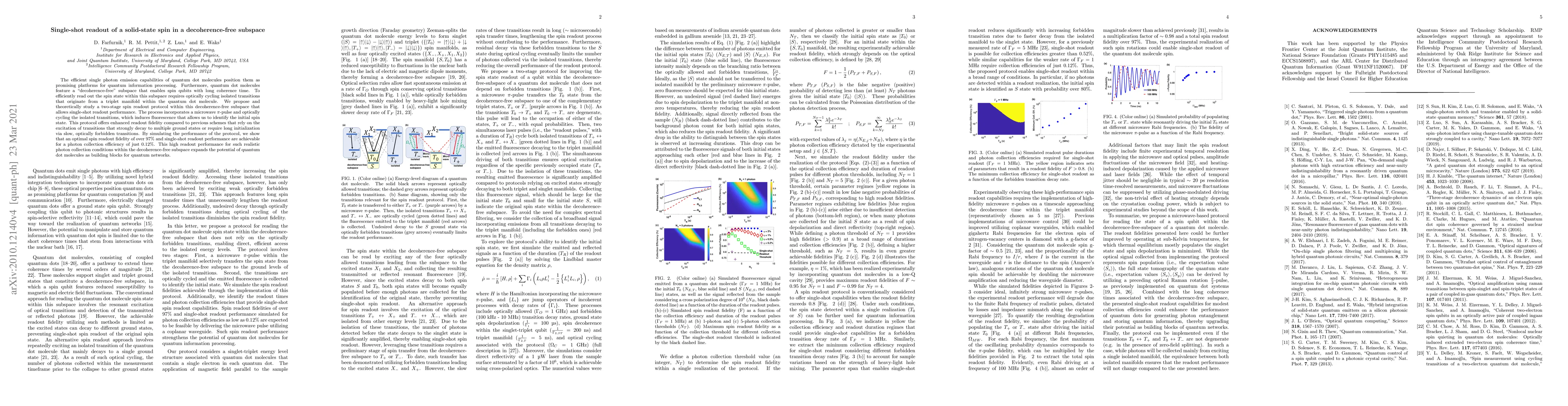 The paper presents a novel two-stage spin readout protocol for quantum dot molecules within a decoherence-free subspace, offering enhanced readout fidelity and single-shot capabilities.