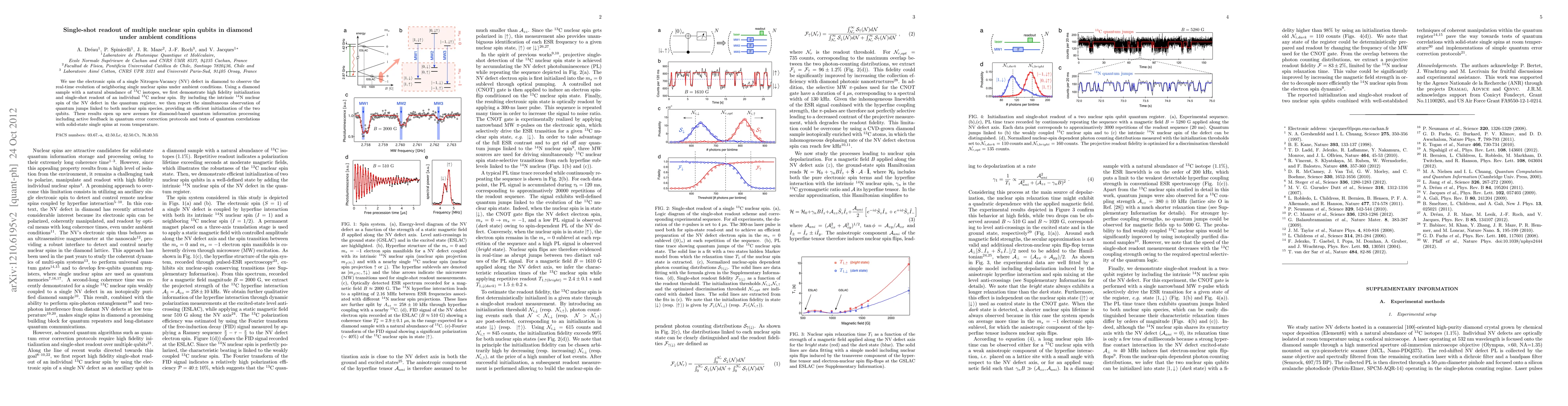 This paper demonstrates high-fidelity single-shot readout of multiple nuclear spin qubits in diamond using a Nitrogen-Vacancy (NV) center, achieving simultaneous observation of $^{13}$C and $^{14}$N nuclear spins under ambient conditions. This advancement facilitates quantum information processing and quantum error correction at room temperature.