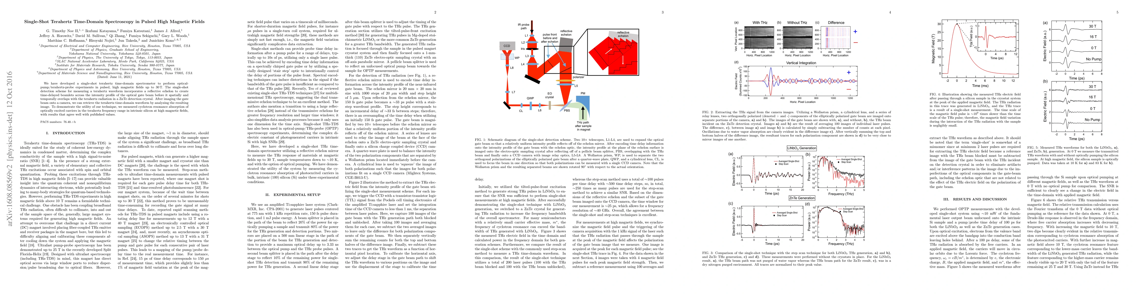 This paper presents a single-shot terahertz time-domain spectrometer for optical-pump/terahertz-probe experiments in pulsed high magnetic fields, utilizing a reflective echelon for time-delayed beamlets. The technique was demonstrated by measuring cyclotron resonance absorption in intrinsic silicon, showing agreement with published values.