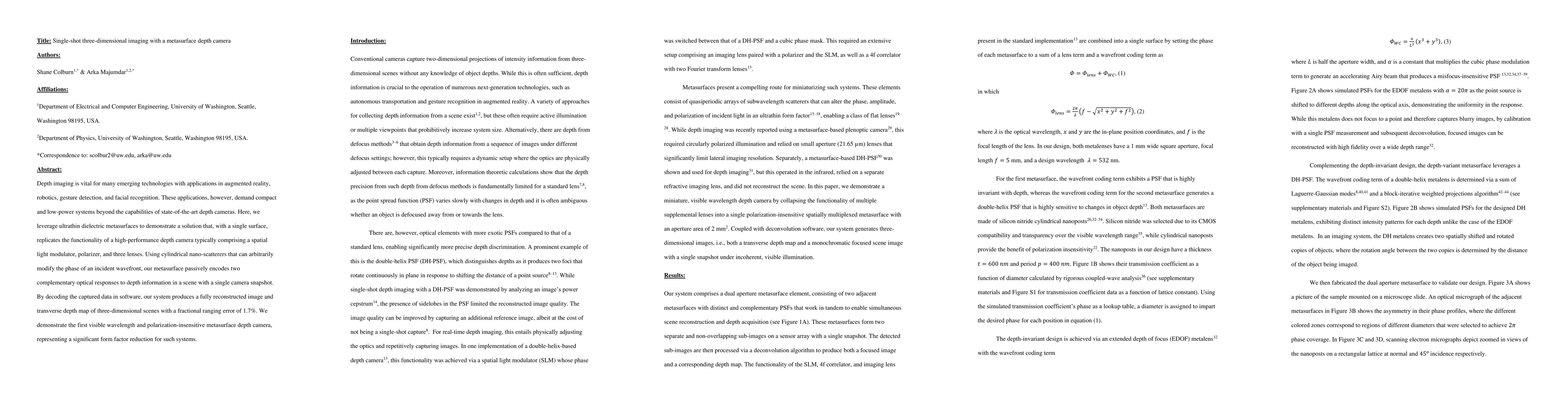 This paper presents a novel metasurface depth camera that uses ultrathin dielectric metasurfaces to achieve single-shot three-dimensional imaging with minimal components, significantly reducing form factor and power consumption compared to traditional depth cameras. The metasurface encodes depth information in a single snapshot, enabling accurate reconstruction of 3D scenes with a low ranging error.