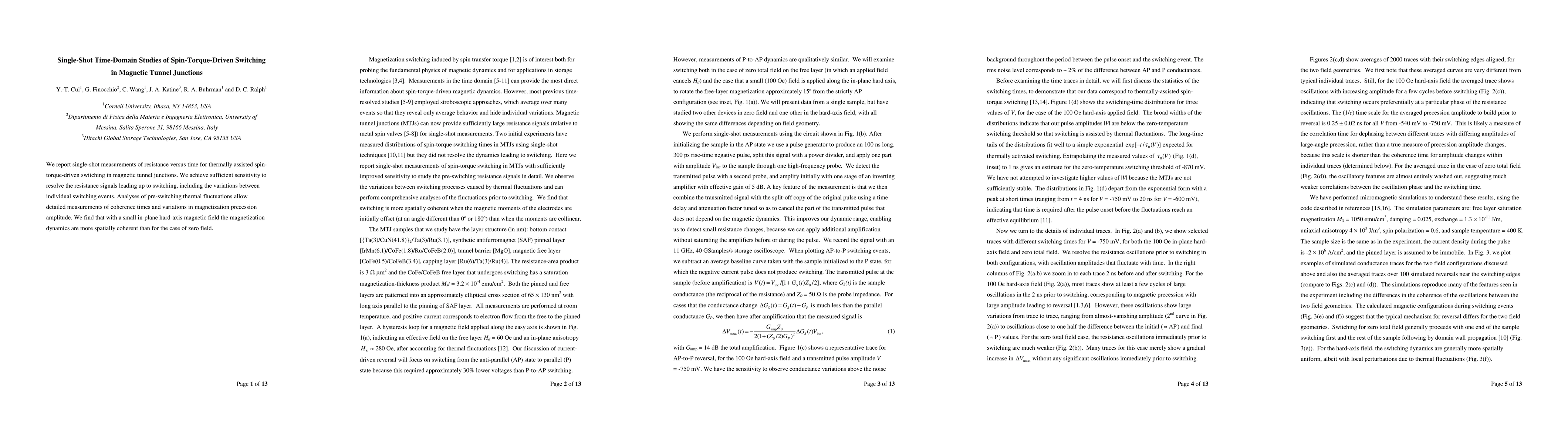 Summary: This paper presents single-shot resistance measurements of spin-torque-driven switching in magnetic tunnel junctions, revealing variations in pre-switching signals and coherence times. The presence of a small in-plane field enhances spatial coherence in magnetization dynamics.