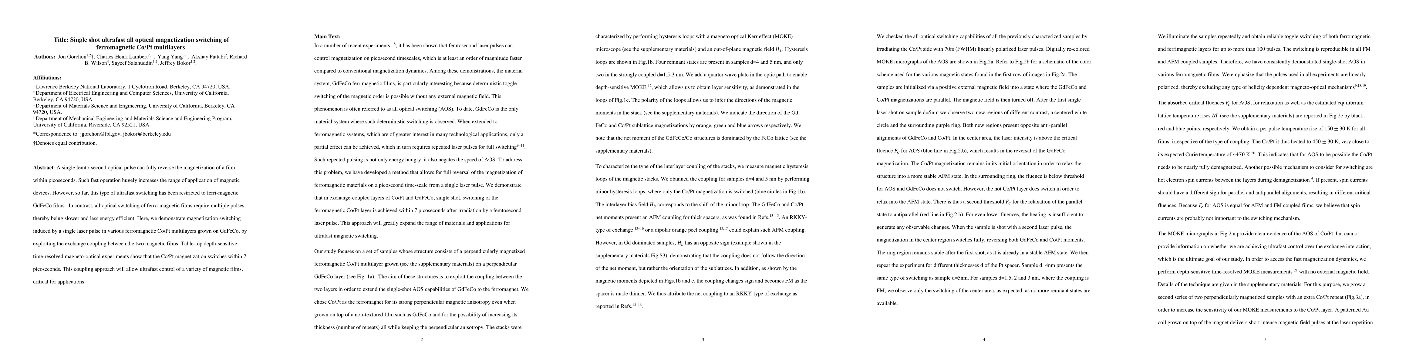 This paper presents a novel method for single-shot, ultrafast all optical switching of ferromagnetic Co/Pt multilayers using femtosecond laser pulses, achieving complete magnetization reversal within 7 picoseconds. This advancement aims to extend the applicability of all optical switching beyond GdFeCo systems, enhancing speed and energy efficiency for technological applications.