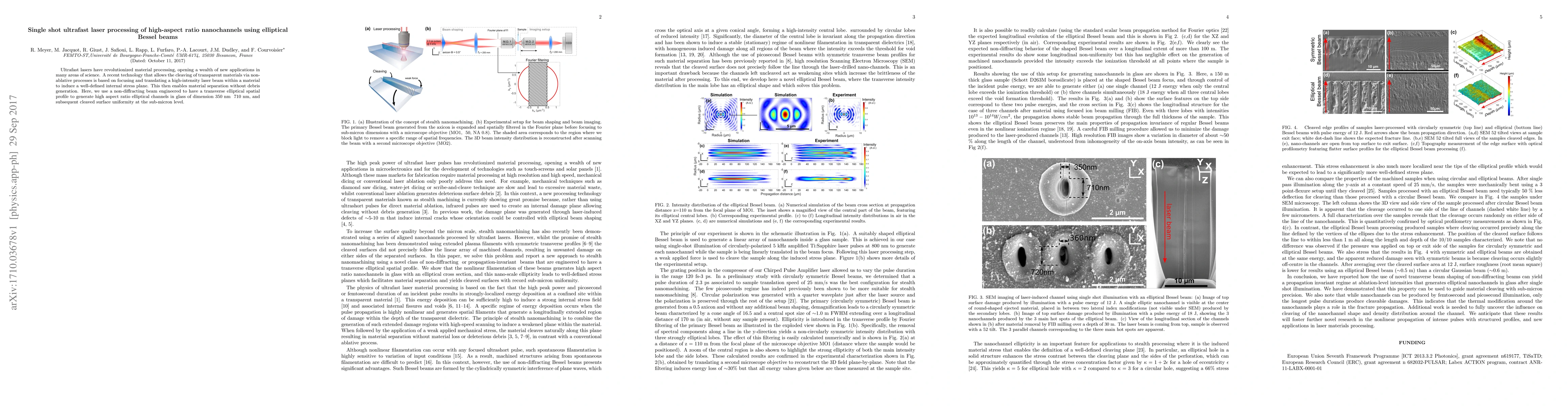 This paper explores the use of ultrafast lasers and elliptical Bessel beams to create high-aspect ratio nanochannels in glass, achieving dimensions of 350 nm x 710 nm with sub-micron surface uniformity, enabling non-ablative material separation without debris.