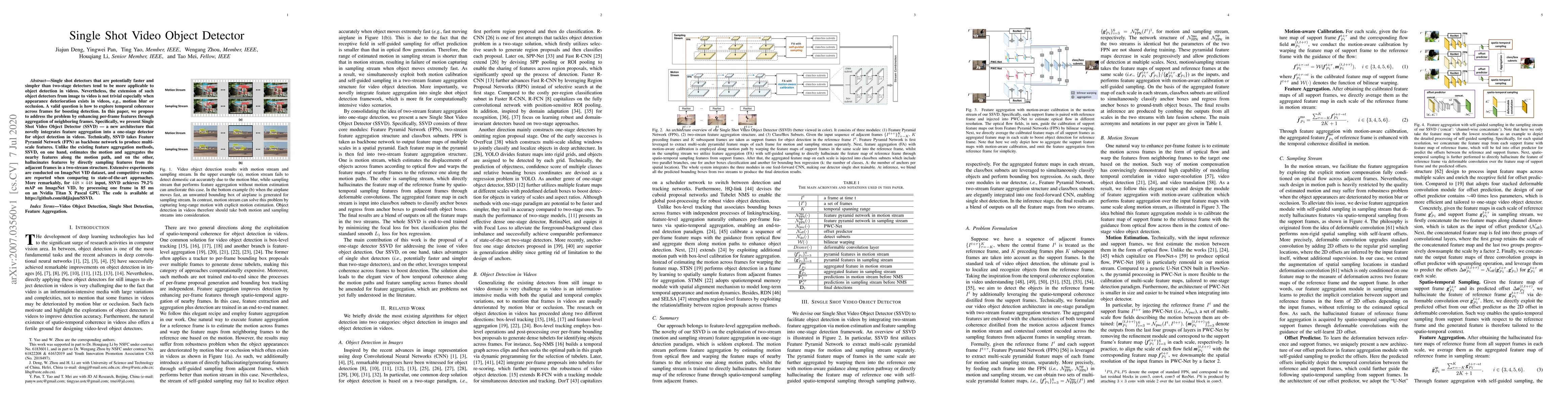 Single shot detectors that are potentially faster and simpler than two-stage detectors tend to be more applicable to object detection in videos. Nevertheless, the extension of such object detectors from image to video is not trivial especially when appearance deterioration exists in videos, \emph{e.g.}, motion blur or occlusion. A valid question is how to explore temporal coherence across frames for boosting detection. In this paper, we propose to address the problem by enhancing per-frame features through aggregation of neighboring frames. Specifically, we present Single Shot Video Object Detector (SSVD) -- a new architecture that novelly integrates feature aggregation into a one-stage detector for object detection in videos. Technically, SSVD takes Feature Pyramid Network (FPN) as backbone network to produce multi-scale features. Unlike the existing feature aggregation methods, SSVD, on one hand, estimates the motion and aggregates the nearby features along the motion path, and on the other, hallucinates features by directly sampling features from the adjacent frames in a two-stream structure. Extensive experiments are conducted on ImageNet VID dataset, and competitive results are reported when comparing to state-of-the-art approaches. More remarkably, for $448 \times 448$ input, SSVD achieves 79.2% mAP on ImageNet VID, by processing one frame in 85 ms on an Nvidia Titan X Pascal GPU. The code is available at \url{https://github.com/ddjiajun/SSVD}.